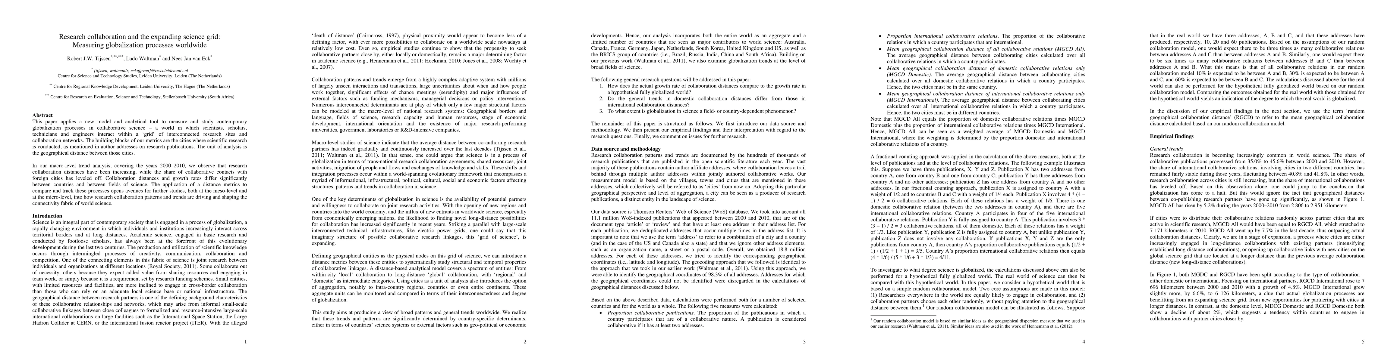 This paper applies a new model and analytical tool to measure and study contemporary globalization processes in collaborative science - a world in which scientists, scholars, technicians and engineers interact within a 'grid' of interconnected research sites and collaboration networks. The building blocks of our metrics are the cities where scientific research is conducted, as mentioned in author addresses on research publications. The unit of analysis is the geographical distance between those cities. In our macro-level trend analysis, covering the years 2000-2010, we observe that research collaboration distances have been increasing, while the share of collaborative contacts with foreign cities has leveled off. Collaboration distances and growth rates differ significantly between countries and between fields of science. The application of a distance metrics to compare and track these processes opens avenues for further studies, both at the meso-level and at the micro-level, into how research collaboration patterns and trends are driving and shaping the connectivity fabric of world science.