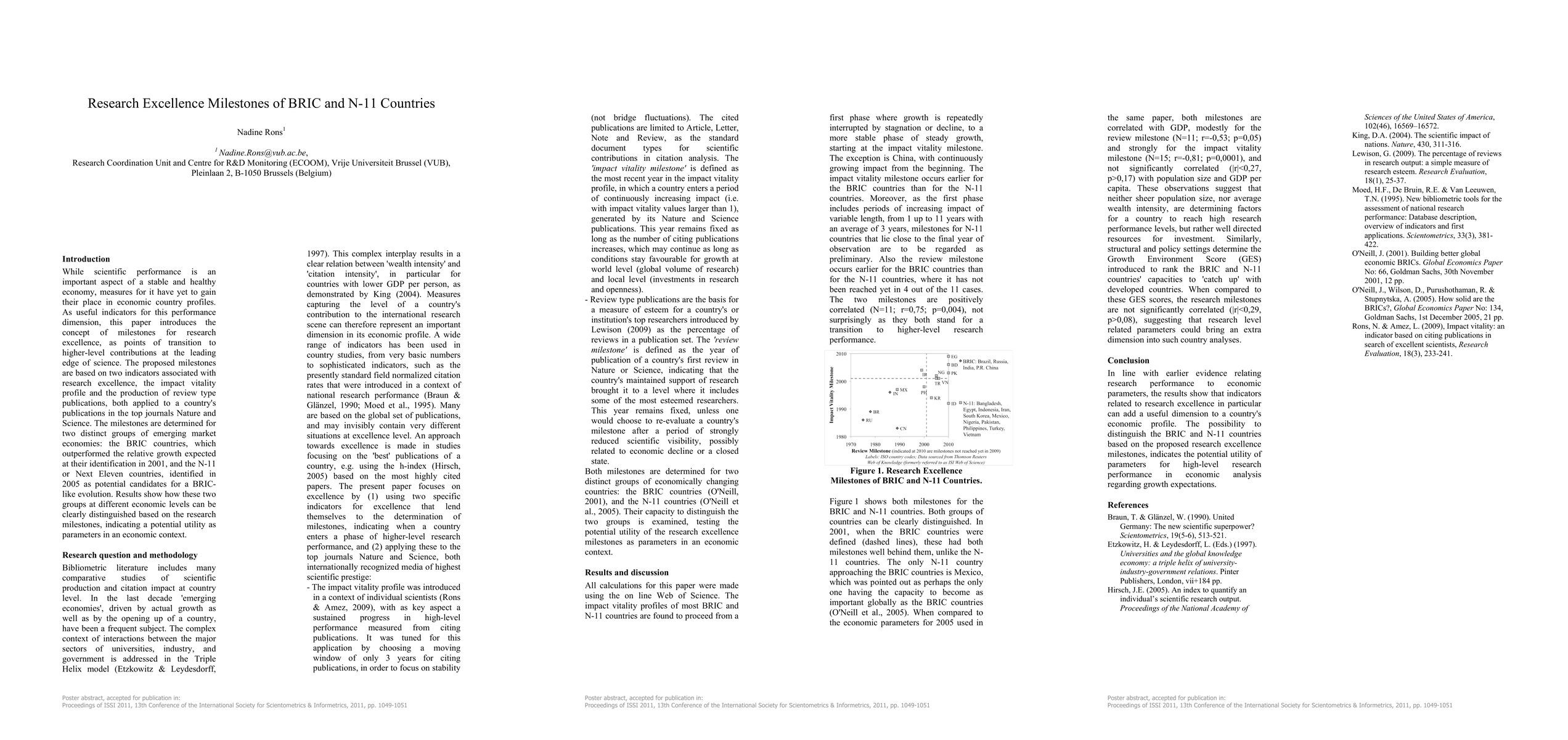 This paper introduces a new framework for measuring research excellence in emerging market economies, using milestones based on impact vitality profile and review-type publications in top scientific journals. It shows that the BRIC and N-11 countries can be distinguished by these milestones, with potential utility as economic indicators.