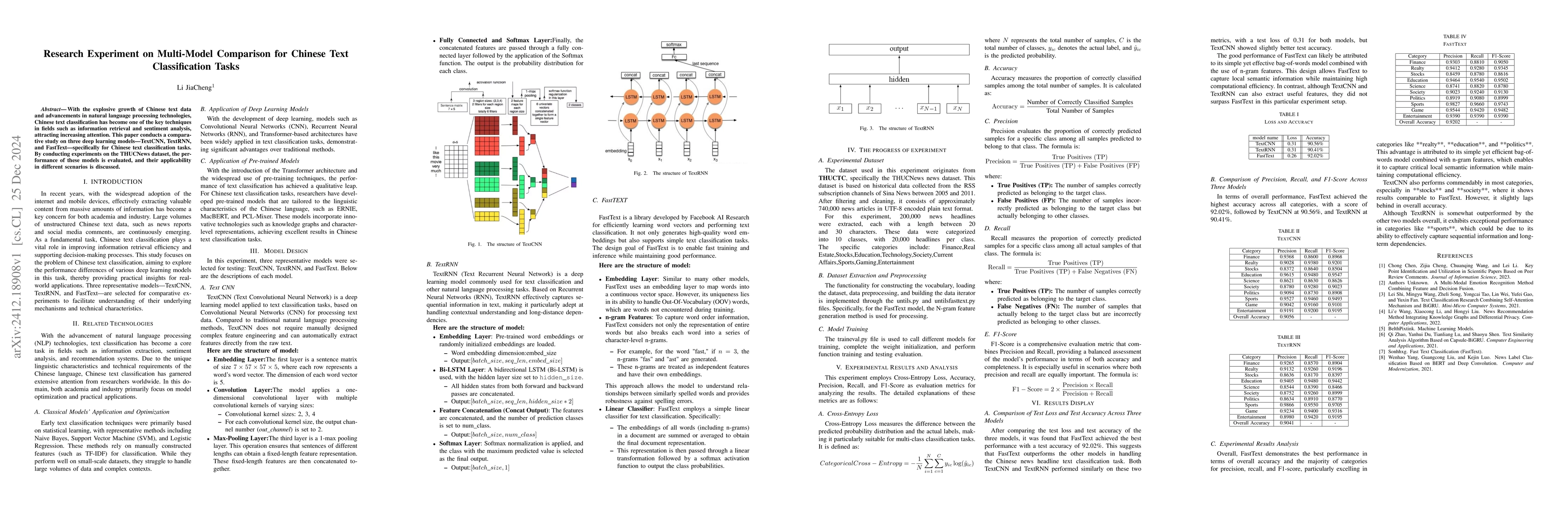 This paper compares the performance of TextCNN, TextRNN, and FastText models for Chinese text classification tasks using the THUCNews dataset, assessing their suitability for various applications in natural language processing. The results provide insights into the strengths and weaknesses of each model in different scenarios.