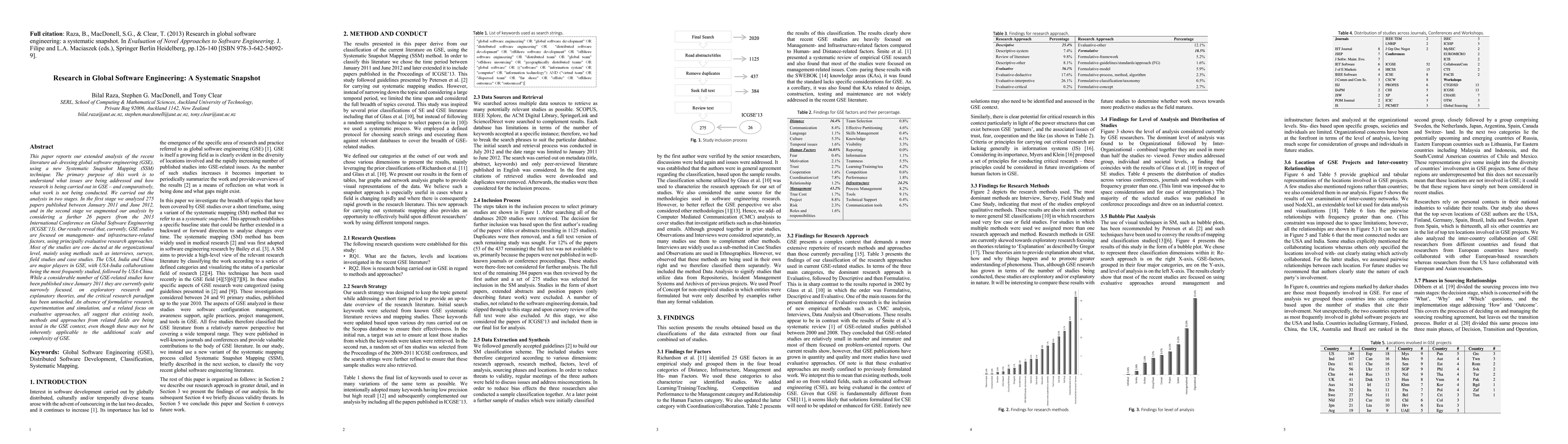This research utilized a Systematic Snapshot Mapping (SSM) technique to analyze 275 papers published between 2011-2013, focusing on global software engineering (GSE) studies. The analysis was divided into two stages, initially examining papers from 2011-2012 and then augmenting with 26 papers from the 2013 ICGSE conference.