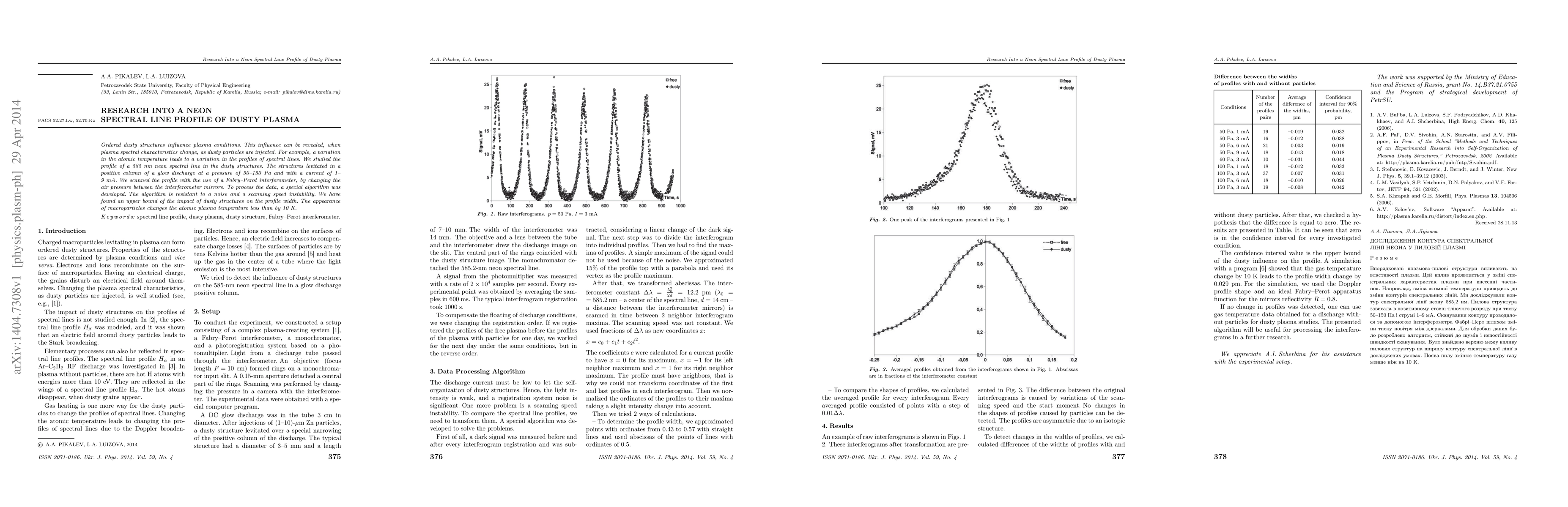 Researchers studied how dusty plasma structures affect a 585 nm neon spectral line profile, finding that macroparticles change atomic temperature by less than 10 K and set an upper bound for impact on profile width.