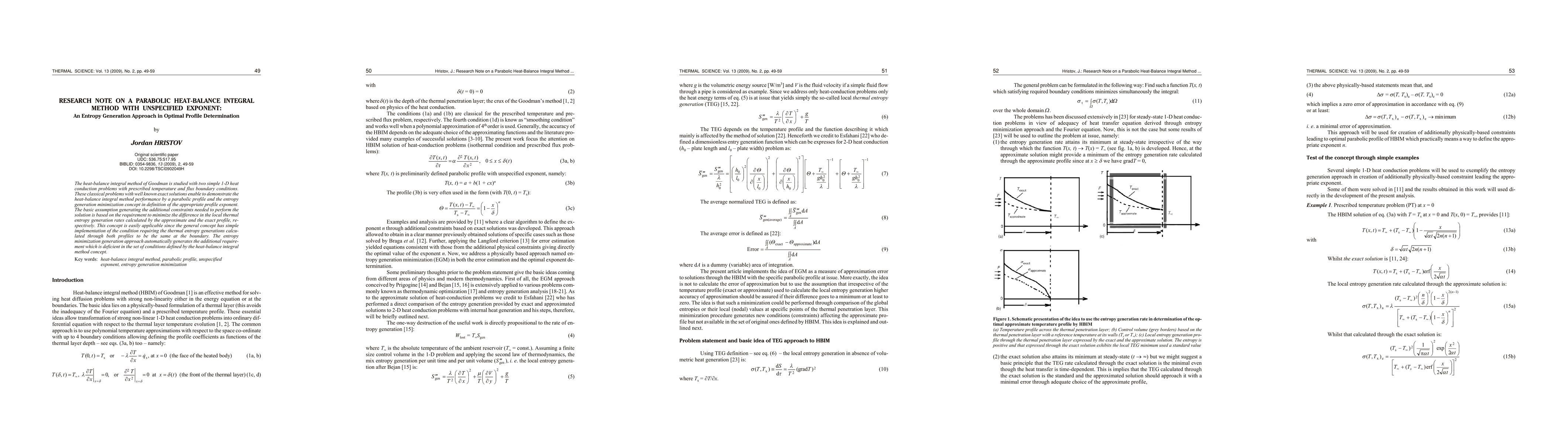 The heat-balance integral method of Goodman is studied with two simple 1-D heat conduction problems with prescribed temperature and flux boundary conditions. These classical problems with well known exact solutions enable to demonstrate the heat-balance integral method performance by a parabolic profile and the entropy generation minimization concept in definition of the appropriate profile exponent. The basic assumption generating the additional constraints needed to perform the solution is based on the requirement to minimize the difference in the local thermal entropy generation rates calculated by the approximate and the exact profile, respectively. This concept is easily applicable since the general concept has simple implementation of the condition requiring the thermal entropy generations calculated through both profiles to be the same at the boundary. The entropy minimization generation approach automatically generates the additional requirement which is deficient in the set of conditions defined by the heat-balance integral method concept.
