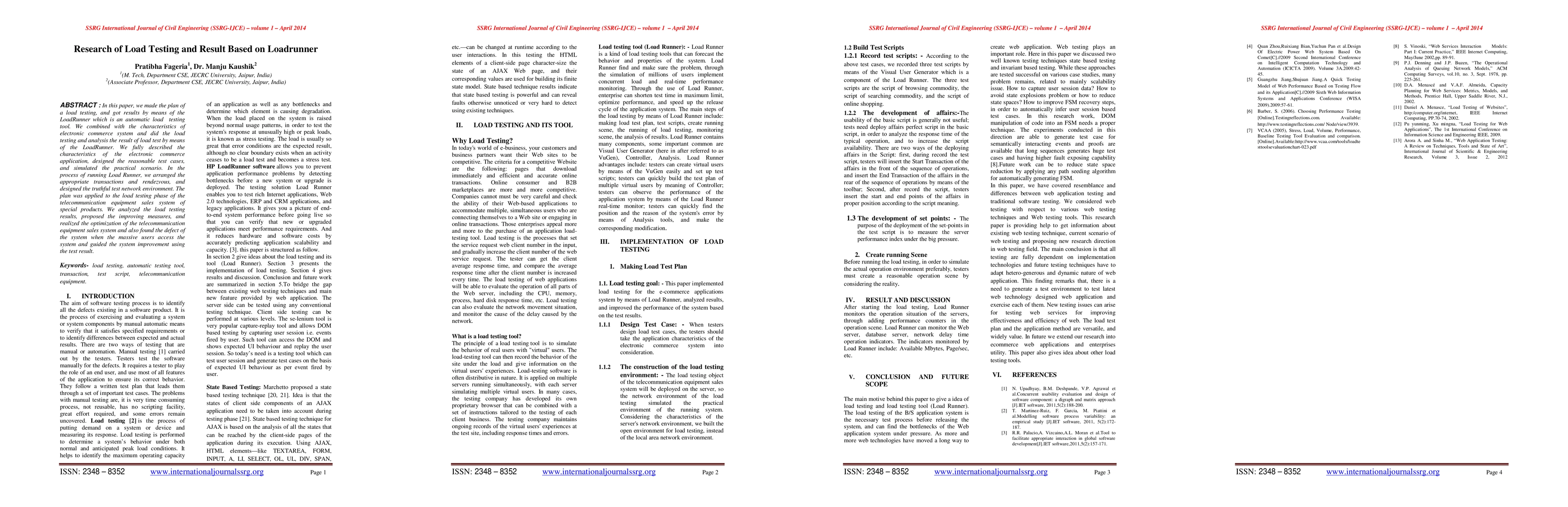 In this paper, we made the plan of a load testing, and got results by means of the LoadRunner which is an automatic load testing tool.We combined with the characteristics of electronic commerce system and did the load testing and analysis the result of load test by means of the LoadRunner. We fully described the characteristics of the electronic commerce application, designed the reasonable test cases,and simulated the practical scenario. In the process of running Load Runner, we arranged the appropriate transactions and rendezvous, and designed the truthful test network environment. The plan was applied to the load testing phase of the telecommunication equipment sales system of special products. We analyzed the load testing results, proposed the improving measures, and realized the optimization of the telecommunication equipment sales system and also found the defect of the system when the massive users access the system and guided the system improvement using the test result.