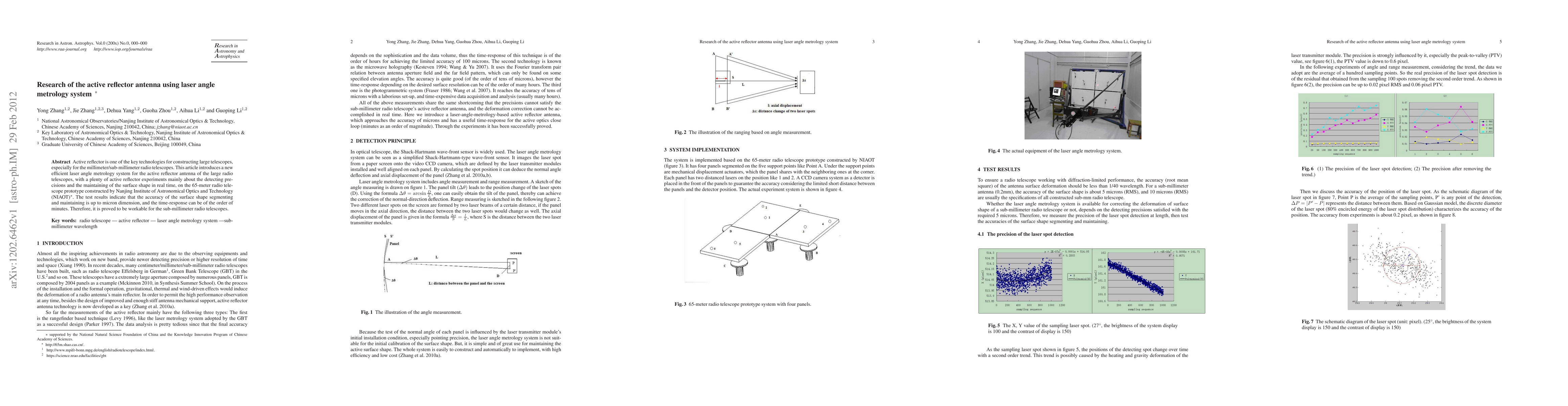 This paper explores an advanced laser angle metrology system for active reflector antennas in large radio telescopes, achieving micron-level precision in surface shape maintenance and real-time adjustments, validated through experiments on a 65-meter prototype telescope. The results demonstrate its effectiveness for sub-millimeter radio telescopes.