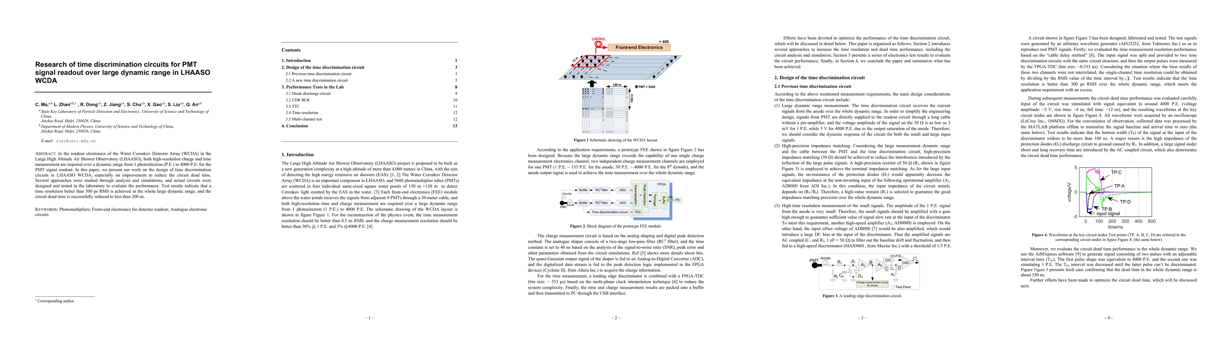 Researchers at LHAASO WCDA developed a time discrimination circuit to improve readout of PMT signals over a large dynamic range, achieving a time resolution better than 500 ps RMS with reduced dead time.