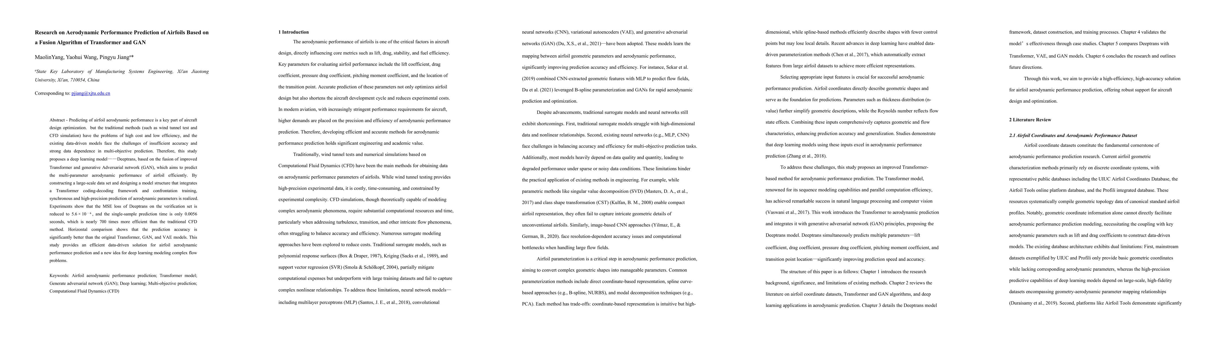 Predicting of airfoil aerodynamic performance is a key part of aircraft design optimization, but the traditional methods (such as wind tunnel test and CFD simulation) have the problems of high cost and low efficiency, and the existing data-driven models face the challenges of insufficient accuracy and strong data dependence in multi-objective prediction. Therefore, this study proposes a deep learning model, Deeptrans, based on the fusion of improved Transformer and generative Adversarial network (GAN), which aims to predict the multi-parameter aerodynamic performance of airfoil efficiently. By constructing a large-scale data set and designing a model structure that integrates a Transformer coding-decoding framework and confrontation training, synchronous and high-precision prediction of aerodynamic parameters is realized. Experiments show that the MSE loss of Deeptrans on the verification set is reduced to 5.6*10-6, and the single-sample prediction time is only 0.0056 seconds, which is nearly 700 times more efficient than the traditional CFD method. Horizontal comparison shows that the prediction accuracy is significantly better than the original Transformer, GAN, and VAE models. This study provides an efficient data-driven solution for airfoil aerodynamic performance prediction and a new idea for deep learning modeling complex flow problems.