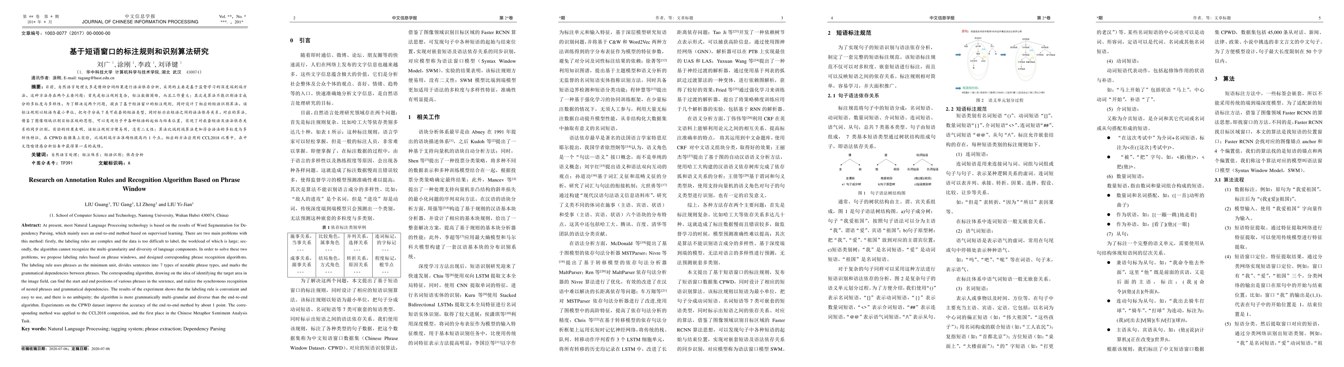 At present, most Natural Language Processing technology is based on the results of Word Segmentation for Dependency Parsing, which mainly uses an end-to-end method based on supervised learning. There are two main problems with this method: firstly, the la-beling rules are complex and the data is too difficult to label, the workload of which is large; secondly, the algorithm cannot recognize the multi-granularity and diversity of language components. In order to solve these two problems, we propose labeling rules based on phrase windows, and designed corresponding phrase recognition algorithms. The labeling rule uses phrases as the minimum unit, di-vides sentences into 7 types of nestable phrase types, and marks the grammatical dependencies between phrases. The corresponding algorithm, drawing on the idea of identifying the target area in the image field, can find the start and end positions of various phrases in the sentence, and realize the synchronous recognition of nested phrases and grammatical dependencies. The results of the experiment shows that the labeling rule is convenient and easy to use, and there is no ambiguity; the algorithm is more grammatically multi-granular and diverse than the end-to-end algorithm. Experiments on the CPWD dataset improve the accuracy of the end-to-end method by about 1 point. The corresponding method was applied to the CCL2018 competition, and the first place in the Chinese Metaphor Sentiment Analysis Task.