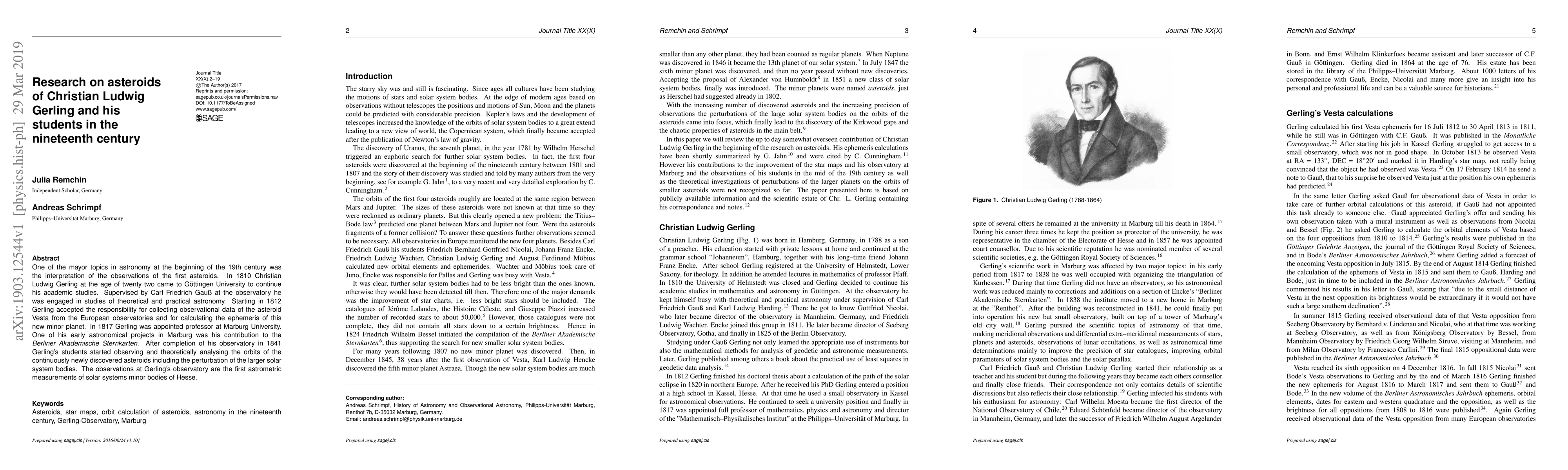 Christian Ludwig Gerling's students in the 19th century studied asteroids, calculating their orbits and analyzing solar system perturbations. Their observations at Gerling's observatory were among the first astrometric measurements of minor bodies in the solar system.