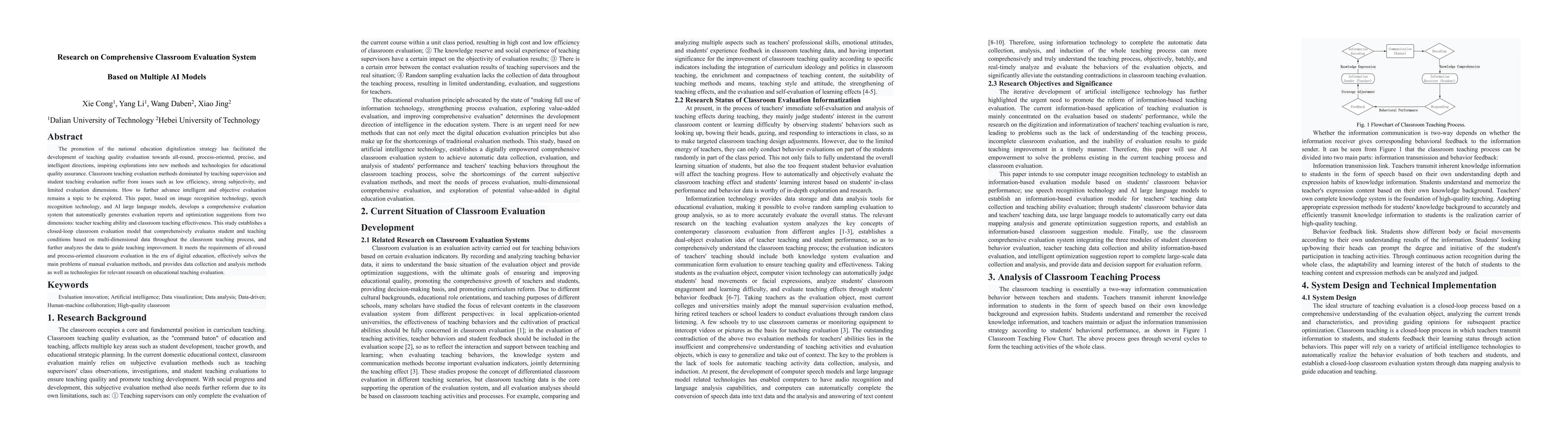 The promotion of the national education digitalization strategy has facilitated the development of teaching quality evaluation towards all-round, process-oriented, precise, and intelligent directions, inspiring explorations into new methods and technologies for educational quality assurance. Classroom teaching evaluation methods dominated by teaching supervision and student teaching evaluation suffer from issues such as low efficiency, strong subjectivity, and limited evaluation dimensions. How to further advance intelligent and objective evaluation remains a topic to be explored. This paper, based on image recognition technology, speech recognition technology, and AI large language models, develops a comprehensive evaluation system that automatically generates evaluation reports and optimization suggestions from two dimensions: teacher teaching ability and classroom teaching effectiveness. This study establishes a closed-loop classroom evaluation model that comprehensively evaluates student and teaching conditions based on multi-dimensional data throughout the classroom teaching process, and further analyzes the data to guide teaching improvement. It meets the requirements of all-round and process-oriented classroom evaluation in the era of digital education, effectively solves the main problems of manual evaluation methods, and provides data collection and analysis methods as well as technologies for relevant research on educational teaching evaluation.