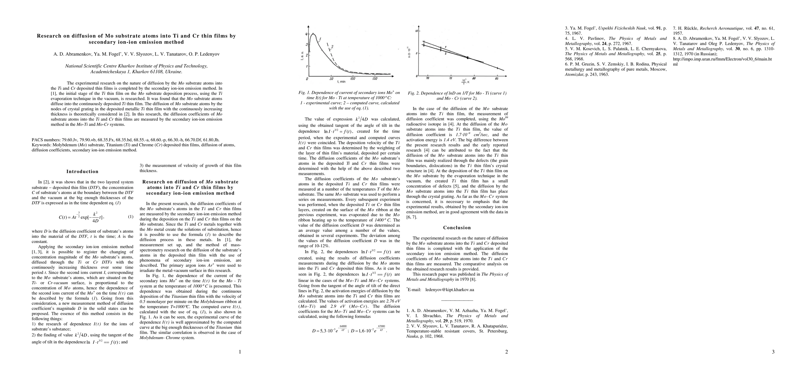 The experimental research on the nature of diffusion by the Mo substrate atoms into the Ti and Cr deposited thin films is completed by the secondary ion-ion emission method. In [1], the initial stage of the Ti thin film on the Mo substrate deposition process, using the Ti evaporation technique in the vacuum, is researched. It was found that the Mo substrate atoms diffuse into the continuously deposited Ti thin film. The diffusion of Mo substrate atoms by the nodes of crystal grating in the deposited metallic Ti thin film with the continuously increasing thickness is theoretically considered in [2]. In this research, the diffusion coefficients of Mo substrate atoms into the Ti and Cr thin films are measured by the secondary ion-ion emission method in the Mo-Ti and Mo-Cr systems.