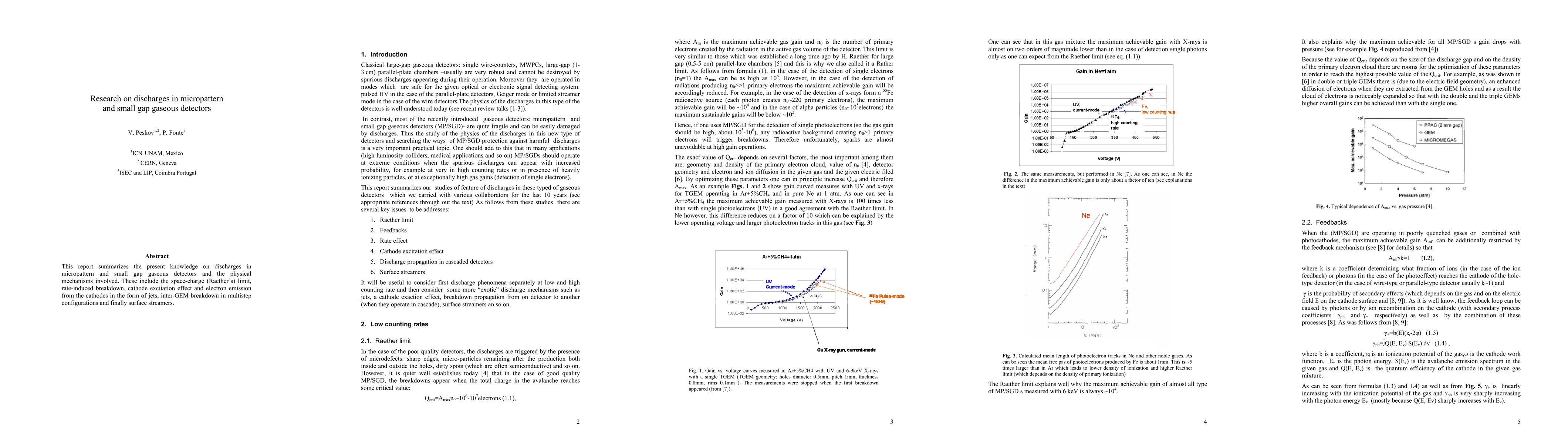 This report summarizes the present knowledge on discharges in micropattern and small gap gaseous detectors and the physical mechanisms involved. These include the space-charge (Raether's) limit, rate-induced breakdown, cathode excitation effect and electron emission from the cathodes in the form of jets, inter-GEM breakdown in multistep configurations and finally surface streamers.
