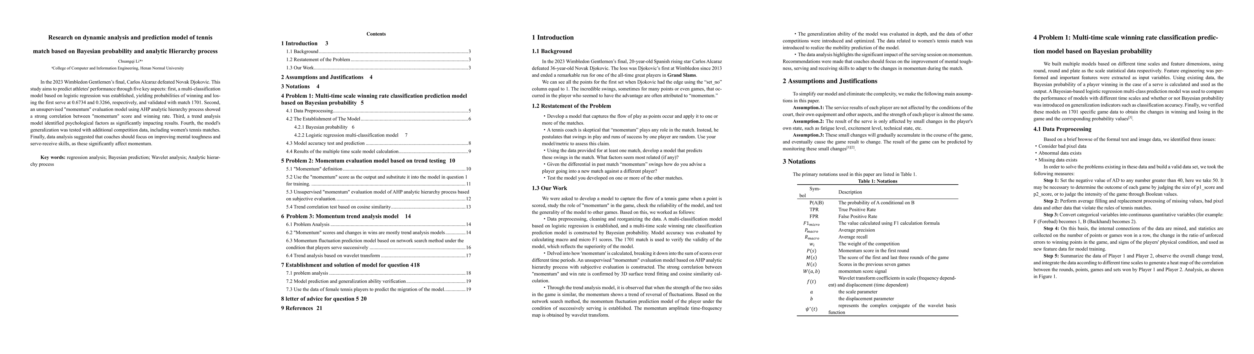 In the 2023 Wimbledon Gentlemen's final, Carlos Alcaraz defeated Novak Djokovic. This study aims to predict athletes' performance through five key aspects: first, a mul-ti-classification model based on logistic regression was established, yielding probabilities of winning and losing the first serve at 0.6734 and 0.3266, respectively, and validated with match 1701. Second, an unsupervised "momentum" evaluation model using AHP analytic hierarchy process showed a strong correlation between "momentum" score and winning rate. Third, a trend analysis model identified psychological factors as significantly impacting re-sults. Fourth, the model's generalization was tested with additional competition data, in-cluding women's tennis matches. Finally, data analysis suggested that coaches should focus on improving mental toughness and serve-receive skills, as these significantly affect mo-mentum.