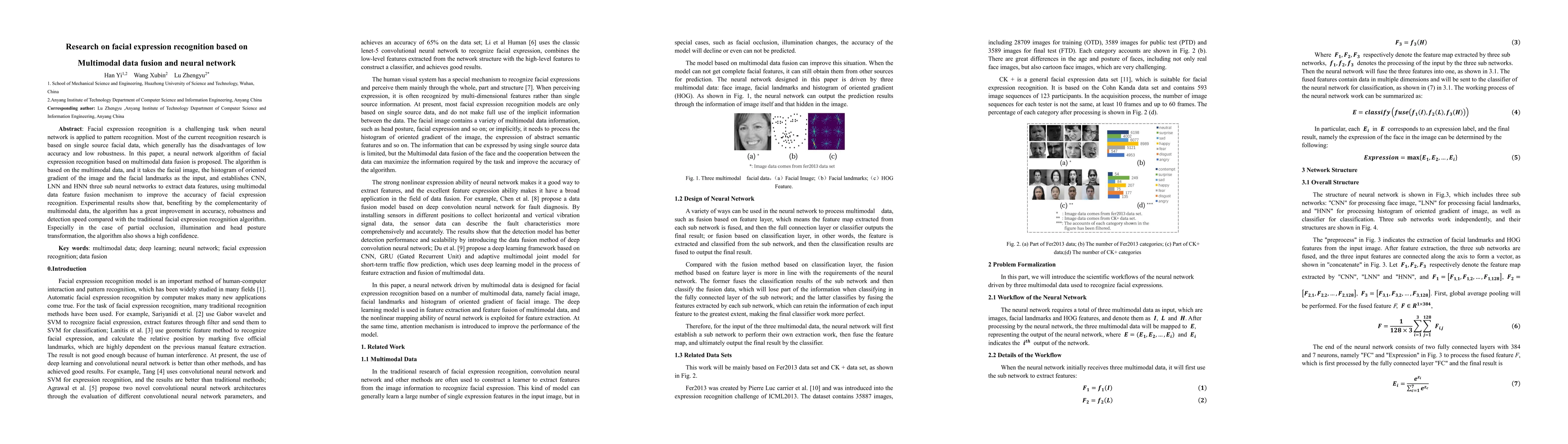 This research proposes a neural network algorithm for facial expression recognition utilizing multimodal data fusion, combining facial images, histogram of oriented gradients, and facial landmarks. The algorithm employs CNN, LNN, and HNN sub-networks to extract features, demonstrating significant improvements in accuracy, robustness, and detection speed compared to traditional methods, especially under conditions of occlusion, varying illumination, and head posture changes.