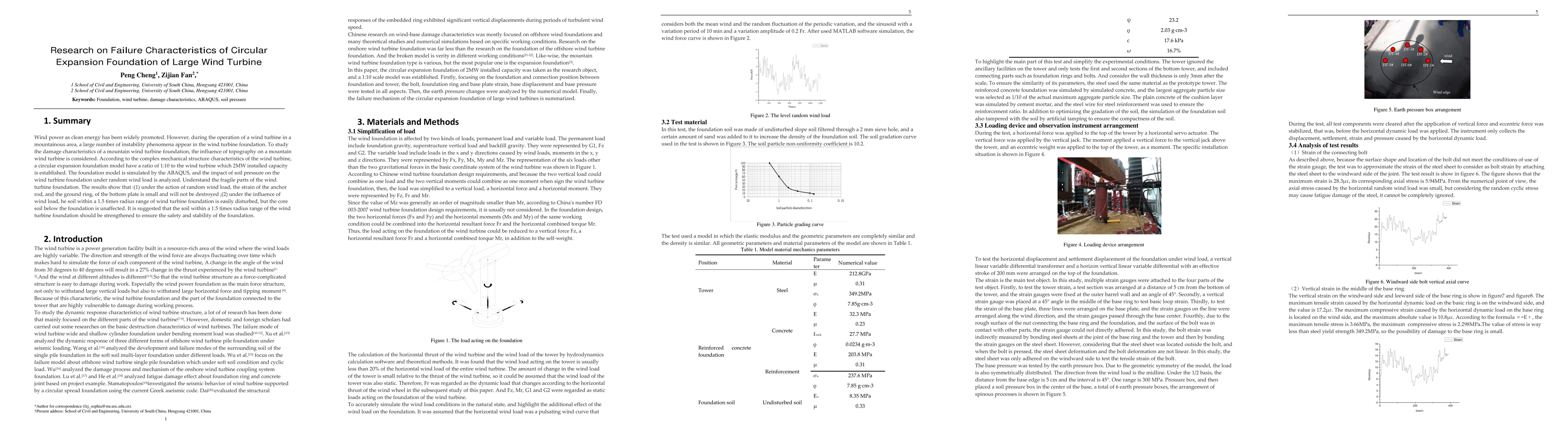 This study investigates the failure characteristics of a circular expansion foundation for large wind turbines in mountainous areas using ABAQUS simulation. Results indicate that while the anchor rod and bottom plate strain are minimal under random wind load, the soil within a 1.5 times radius of the foundation is easily disturbed, suggesting reinforcement is needed for stability.