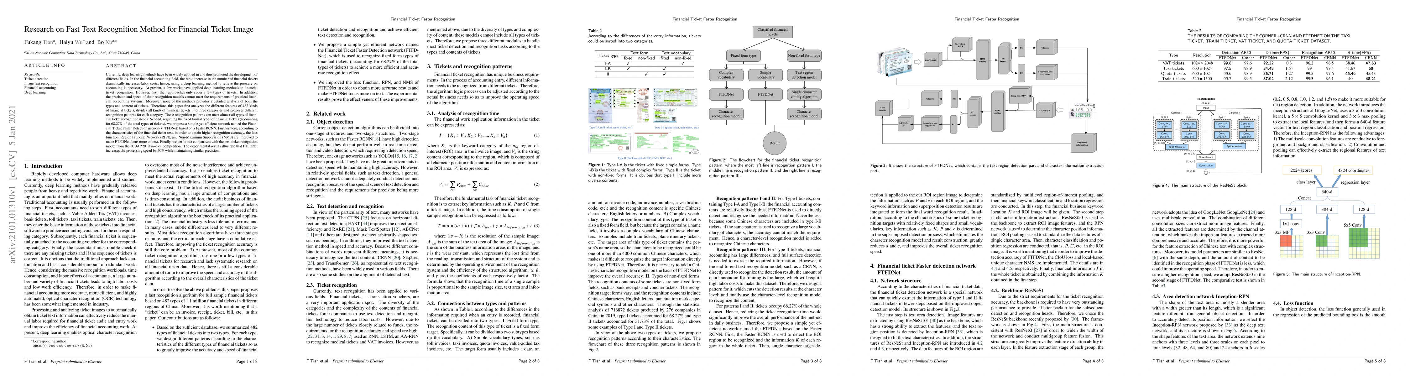 Currently, deep learning methods have been widely applied in and thus promoted the development of different fields. In the financial accounting field, the rapid increase in the number of financial tickets dramatically increases labor costs; hence, using a deep learning method to relieve the pressure on accounting is necessary. At present, a few works have applied deep learning methods to financial ticket recognition. However, first, their approaches only cover a few types of tickets. In addition, the precision and speed of their recognition models cannot meet the requirements of practical financial accounting systems. Moreover, none of the methods provides a detailed analysis of both the types and content of tickets. Therefore, this paper first analyzes the different features of 482 kinds of financial tickets, divides all kinds of financial tickets into three categories and proposes different recognition patterns for each category. These recognition patterns can meet almost all types of financial ticket recognition needs. Second, regarding the fixed format types of financial tickets (accounting for 68.27\% of the total types of tickets), we propose a simple yet efficient network named the Financial Ticket Faster Detection network (FTFDNet) based on a Faster RCNN. Furthermore, according to the characteristics of the financial ticket text, in order to obtain higher recognition accuracy, the loss function, Region Proposal Network (RPN), and Non-Maximum Suppression (NMS) are improved to make FTFDNet focus more on text. Finally, we perform a comparison with the best ticket recognition model from the ICDAR2019 invoice competition. The experimental results illustrate that FTFDNet increases the processing speed by 50\% while maintaining similar precision.