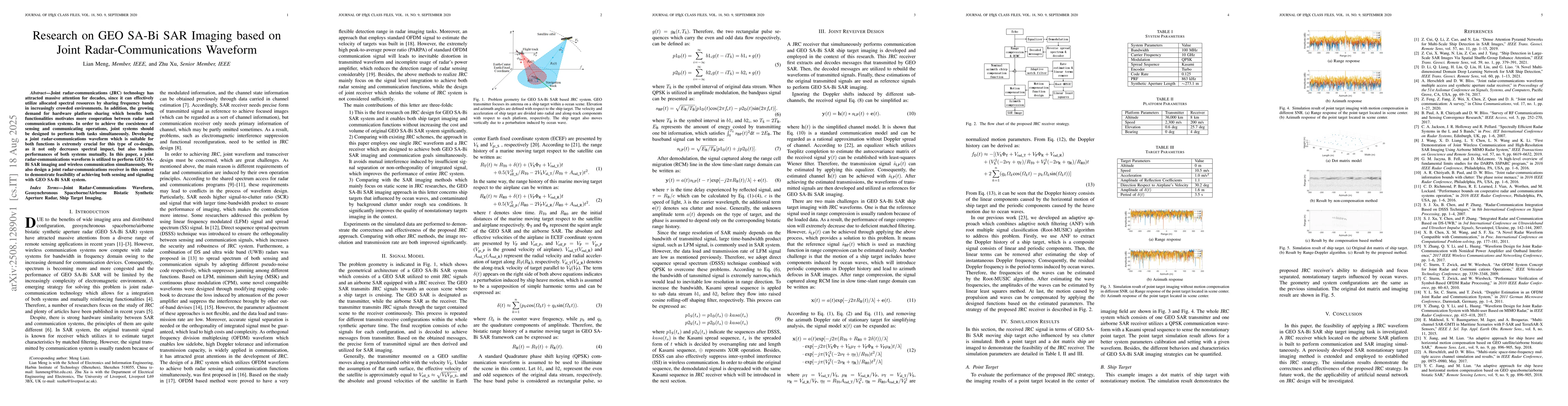 Joint radar-communications (JRC) technology has attracted massive attention for decades, since it can effectively utilize allocated spectral resources by sharing frequency bands in increasingly crowded environments. In addition, the growing demand for hardware platform sharing which benefits both functionalities motivates more cooperation between radar and communication systems. In order to achieve the coexistence of sensing and communicating operations, joint systems should be designed to perform both tasks simultaneously. Developing a joint radar-communications waveform which is suitable for both functions is extremely crucial for this type of co-design, as it not only decreases spectral impact, but also benefits performances of both systems mutually. In this paper, a joint radar-communications waveform is utilized to perform GEO SA-Bi SAR imaging and wireless communication simultaneously. We also design a joint radar-communications receiver in this context to demonstrate feasibility of achieving both sensing and signaling with GEO SA-Bi SAR system.