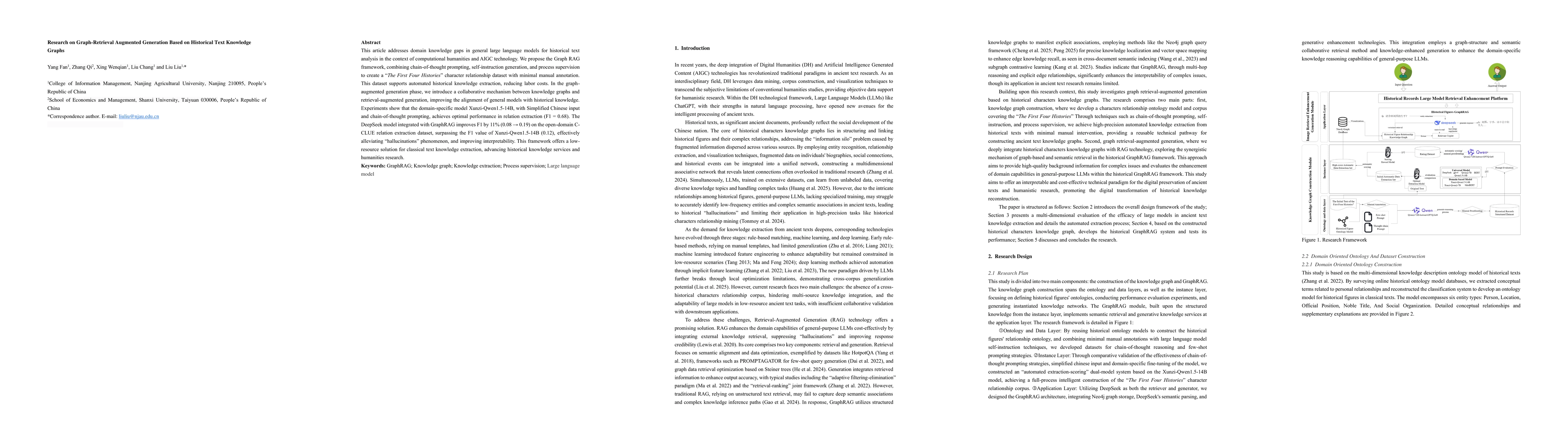 This article addresses domain knowledge gaps in general large language models for historical text analysis in the context of computational humanities and AIGC technology. We propose the Graph RAG framework, combining chain-of-thought prompting, self-instruction generation, and process supervision to create a The First Four Histories character relationship dataset with minimal manual annotation. This dataset supports automated historical knowledge extraction, reducing labor costs. In the graph-augmented generation phase, we introduce a collaborative mechanism between knowledge graphs and retrieval-augmented generation, improving the alignment of general models with historical knowledge. Experiments show that the domain-specific model Xunzi-Qwen1.5-14B, with Simplified Chinese input and chain-of-thought prompting, achieves optimal performance in relation extraction (F1 = 0.68). The DeepSeek model integrated with GraphRAG improves F1 by 11% (0.08-0.19) on the open-domain C-CLUE relation extraction dataset, surpassing the F1 value of Xunzi-Qwen1.5-14B (0.12), effectively alleviating hallucinations phenomenon, and improving interpretability. This framework offers a low-resource solution for classical text knowledge extraction, advancing historical knowledge services and humanities research.