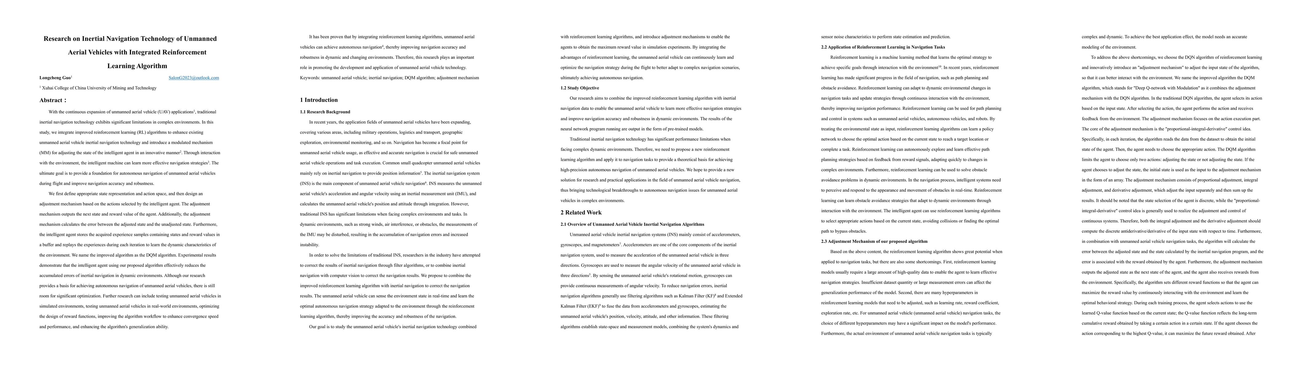 This paper proposes a DQM algorithm integrating reinforcement learning to improve the inertial navigation of unmanned aerial vehicles (UAVs) by reducing accumulated errors. The algorithm effectively learns dynamic environment characteristics through experience replay, but further optimization and real-world testing are recommended for broader application.