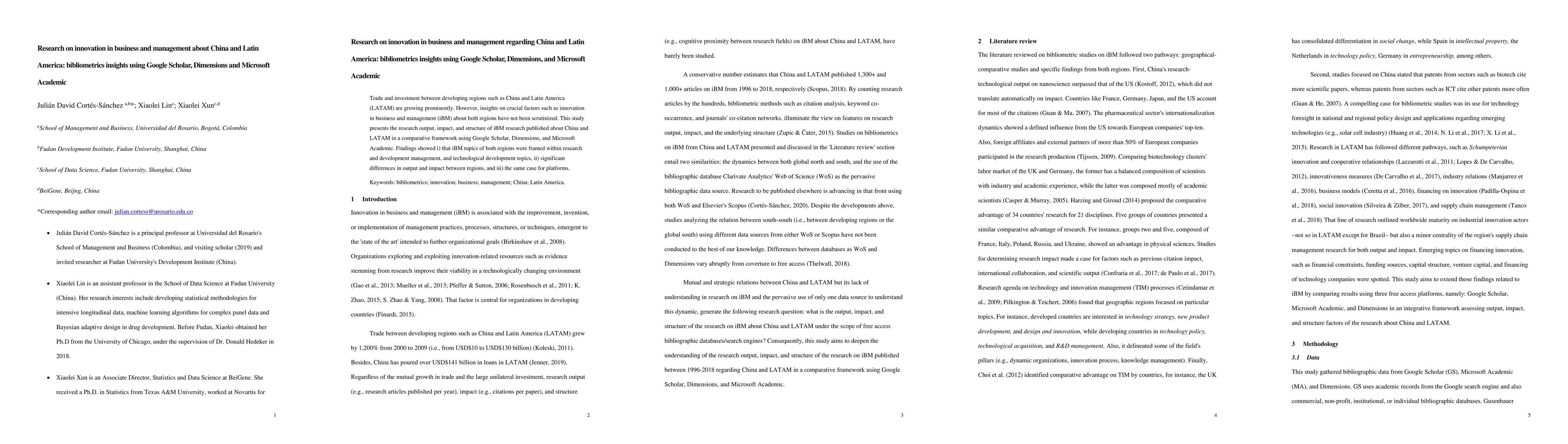 Trade and investment between developing regions such as China and Latin America (LATAM) are growing prominently. However, insights on crucial factors such as innovation in business and management (iBM) about both regions have not been scrutinized. This study presents the research output, impact, and structure of iBM research published about China and LATAM in a comparative framework using Google Scholar, Dimensions, and Microsoft Academic. Findings showed i) that iBM topics of both regions were framed within research and development management, and technological development topics, ii) significant differences in output and impact between regions, and iii) the same case for platforms.