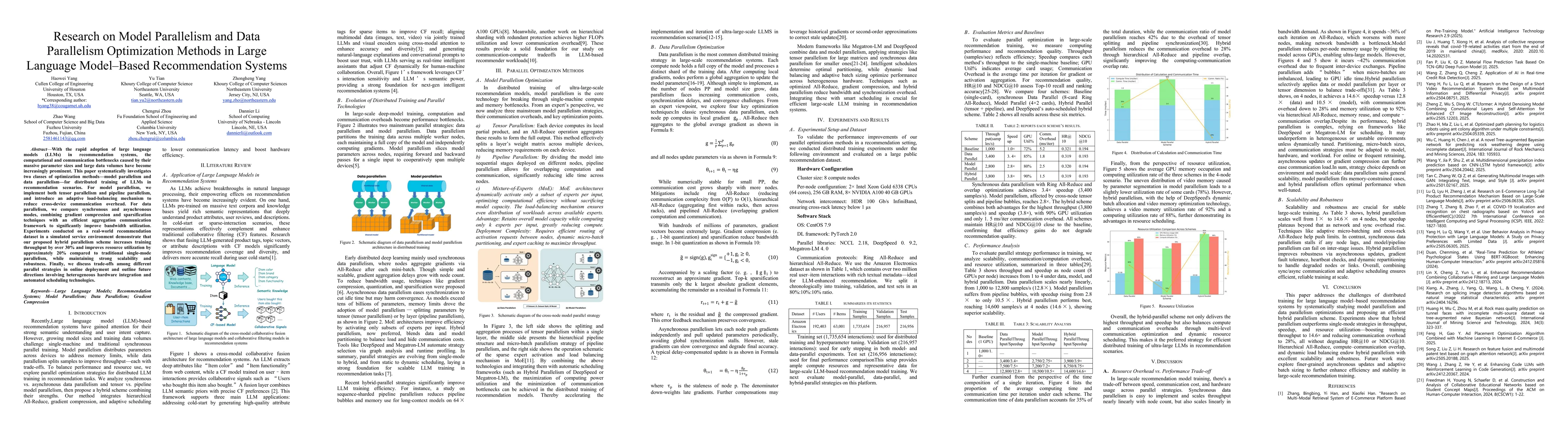 This paper explores model and data parallelism methods to optimize large language model training in recommendation systems, introducing adaptive load-balancing for model parallelism and gradient compression for data parallelism. Results show a 30% increase in training throughput and 20% improvement in resource utilization over traditional methods, with strong scalability and robustness, while discussing future directions like heterogeneous hardware and automated scheduling.