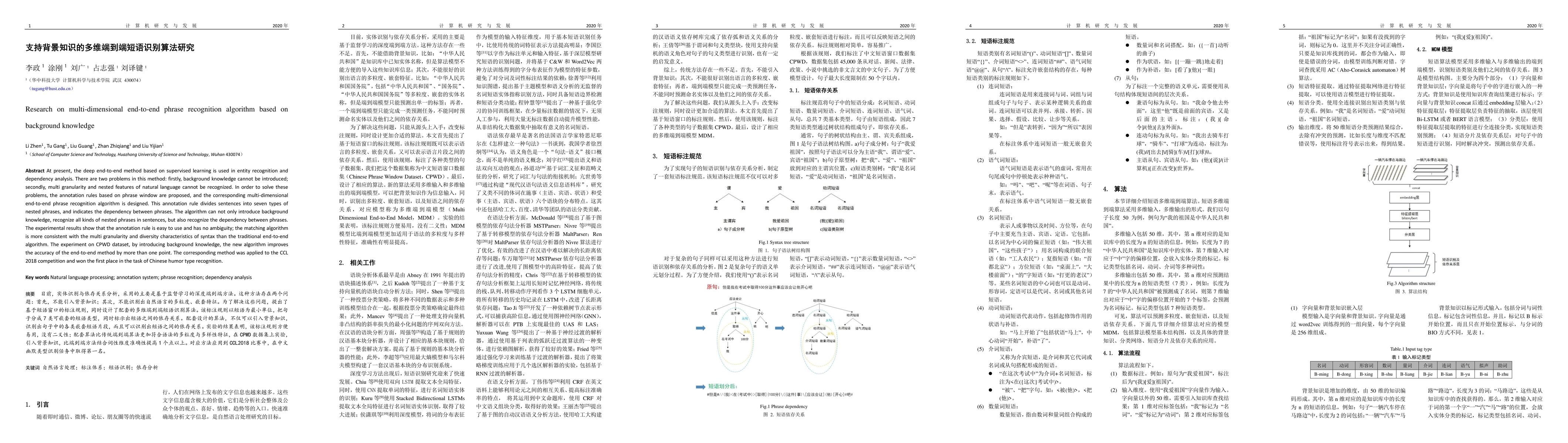 At present, the deep end-to-end method based on supervised learning is used in entity recognition and dependency analysis. There are two problems in this method: firstly, background knowledge cannot be introduced; secondly, multi granularity and nested features of natural language cannot be recognized. In order to solve these problems, the annotation rules based on phrase window are proposed, and the corresponding multi-dimensional end-to-end phrase recognition algorithm is designed. This annotation rule divides sentences into seven types of nested phrases, and indicates the dependency between phrases. The algorithm can not only introduce background knowledge, recognize all kinds of nested phrases in sentences, but also recognize the dependency between phrases. The experimental results show that the annotation rule is easy to use and has no ambiguity; the matching algorithm is more consistent with the multi granularity and diversity characteristics of syntax than the traditional end-to-end algorithm. The experiment on CPWD dataset, by introducing background knowledge, the new algorithm improves the accuracy of the end-to-end method by more than one point. The corresponding method was applied to the CCL 2018 competition and won the first place in the task of Chinese humor type recognition.