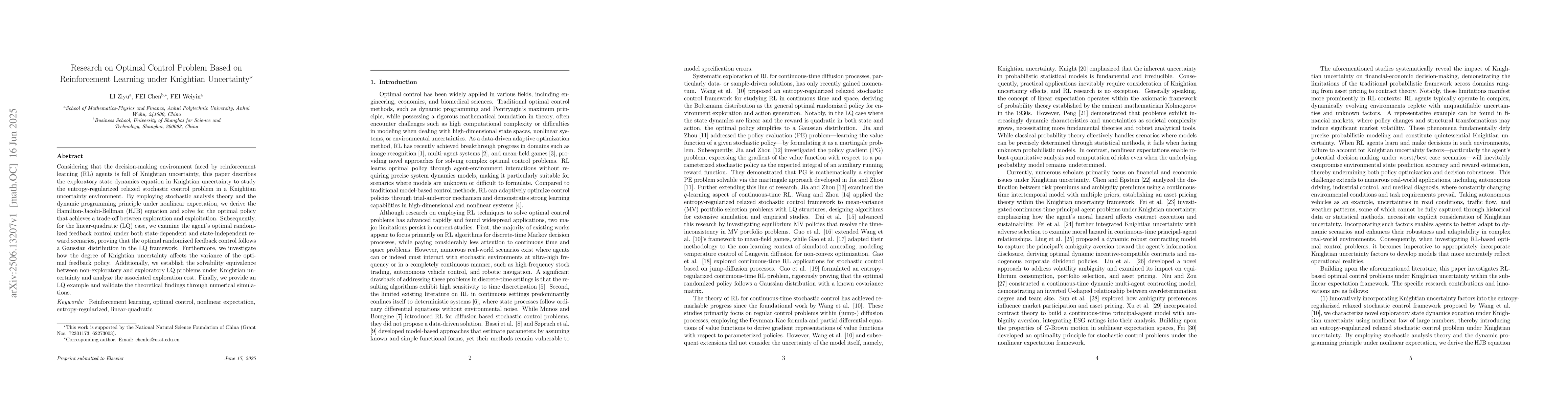 This research paper explores optimal control problems in reinforcement learning under Knightian uncertainty, deriving an exploratory state dynamics equation and HJB equation via stochastic analysis. It proves optimal randomized feedback control follows a Gaussian distribution in the linear-quadratic case, examines Knightian uncertainty's impact on policy variance, and establishes equivalence between non-exploratory and exploratory LQ problems. The findings are validated through numerical simulations.