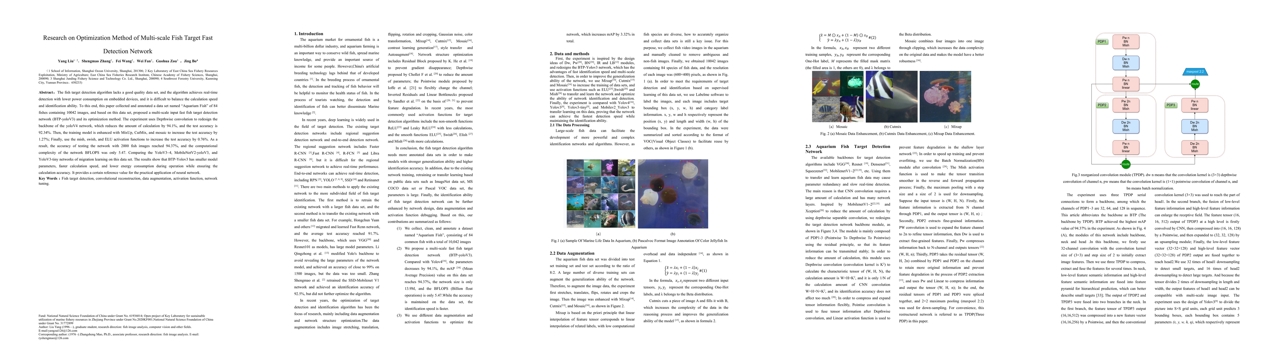 The fish target detection algorithm lacks a good quality data set, and the algorithm achieves real-time detection with lower power consumption on embedded devices, and it is difficult to balance the calculation speed and identification ability. To this end, this paper collected and annotated a data set named "Aquarium Fish" of 84 fishes containing 10042 images, and based on this data set, proposed a multi-scale input fast fish target detection network (BTP-yoloV3) and its optimization method. The experiment uses Depthwise convolution to redesign the backbone of the yoloV4 network, which reduces the amount of calculation by 94.1%, and the test accuracy is 92.34%. Then, the training model is enhanced with MixUp, CutMix, and mosaic to increase the test accuracy by 1.27%; Finally, use the mish, swish, and ELU activation functions to increase the test accuracy by 0.76%. As a result, the accuracy of testing the network with 2000 fish images reached 94.37%, and the computational complexity of the network BFLOPS was only 5.47. Comparing the YoloV3~4, MobileNetV2-yoloV3, and YoloV3-tiny networks of migration learning on this data set. The results show that BTP-Yolov3 has smaller model parameters, faster calculation speed, and lower energy consumption during operation while ensuring the calculation accuracy. It provides a certain reference value for the practical application of neural network.