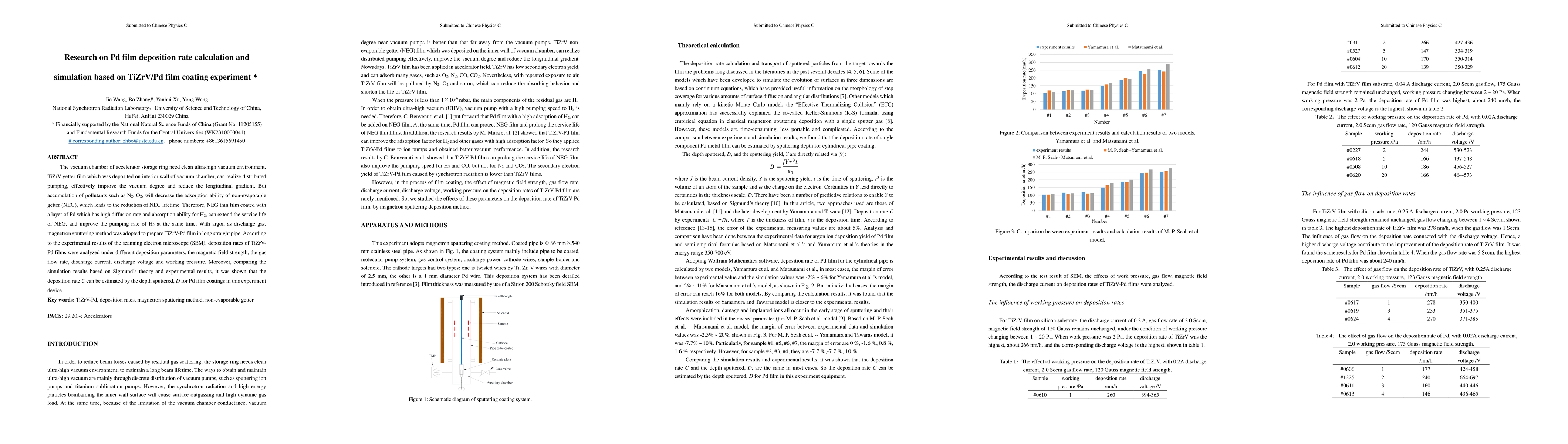 This research investigates the deposition rate calculation and simulation for Pd films coated on TiZrV getter films, enhancing their ability to adsorb H2 and extend the service life of non-evaporable getters in vacuum environments. The magnetron sputtering method was used to prepare the films, and the deposition rates were analyzed under various parameters, showing good correlation between simulation and experimental results.