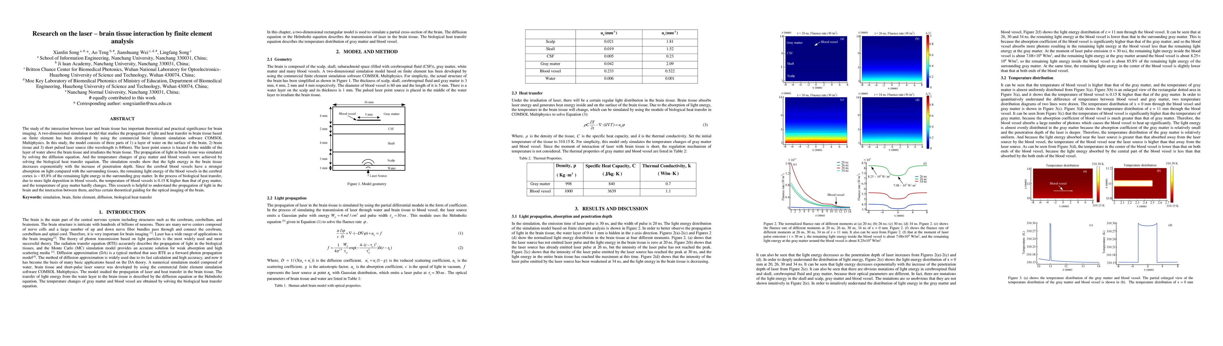 This study uses finite element analysis to simulate the interaction between laser and brain tissue, focusing on light propagation and heat transfer. The results indicate that light energy decreases exponentially with depth, and blood vessels absorb more light, leading to a 0.15 K higher temperature in blood vessels compared to gray matter, providing insights for optical brain imaging.
