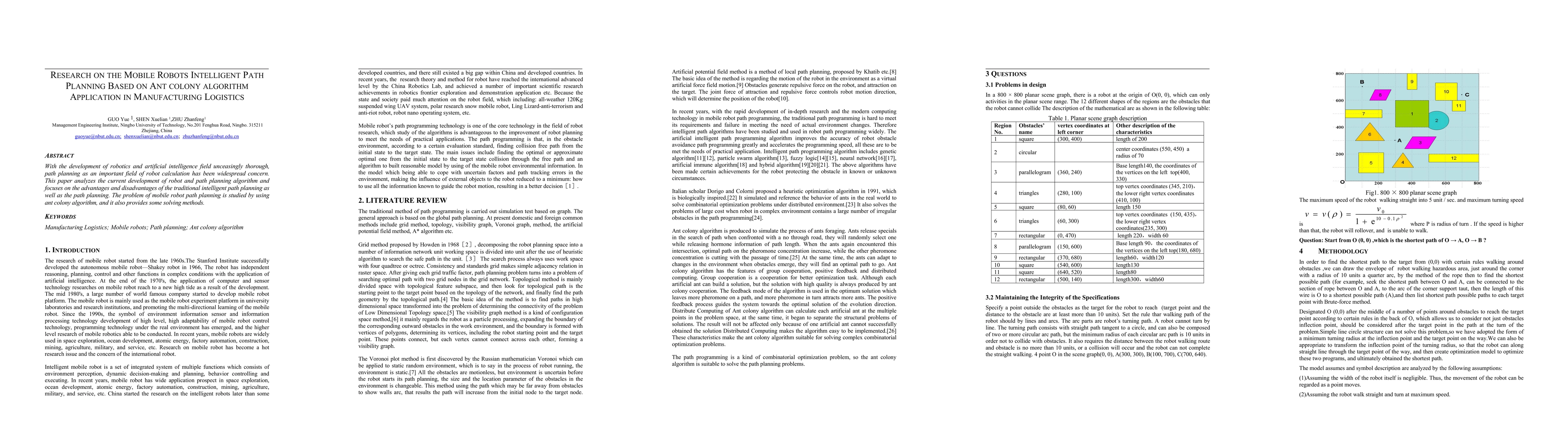 This paper investigates the application of the ant colony algorithm for intelligent path planning in mobile robots used in manufacturing logistics, analyzing both traditional methods and proposing new solving techniques to enhance efficiency and accuracy.