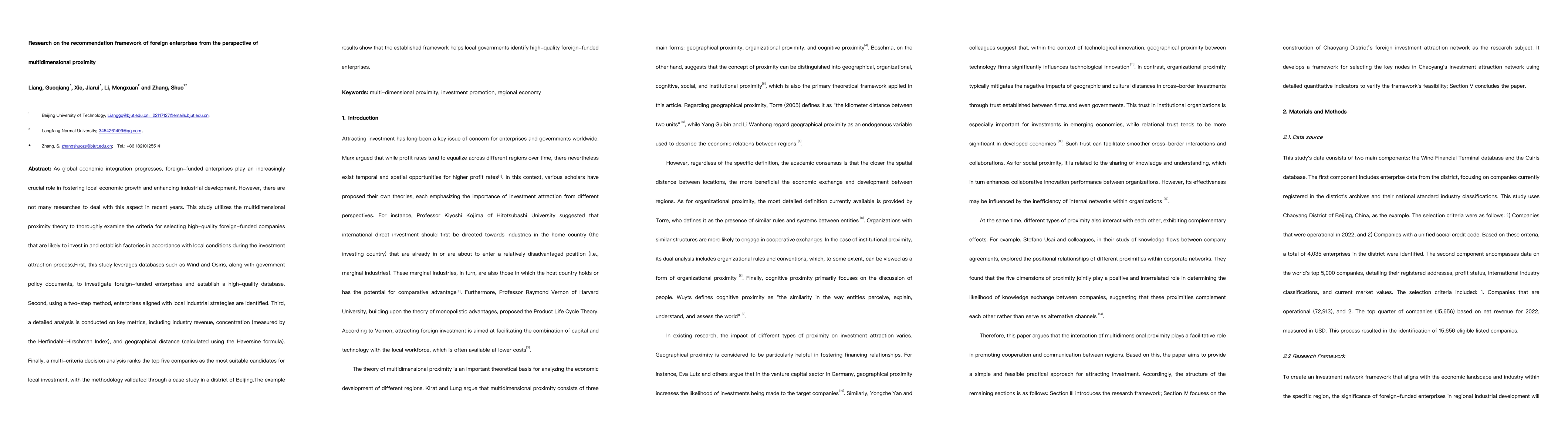 As global economic integration progresses, foreign-funded enterprises play an increasingly crucial role in fostering local economic growth and enhancing industrial development. However, there are not many researches to deal with this aspect in recent years. This study utilizes the multidimensional proximity theory to thoroughly examine the criteria for selecting high-quality foreign-funded companies that are likely to invest in and establish factories in accordance with local conditions during the investment attraction process.First, this study leverages databases such as Wind and Osiris, along with government policy documents, to investigate foreign-funded enterprises and establish a high-quality database. Second, using a two-step method, enterprises aligned with local industrial strategies are identified. Third, a detailed analysis is conducted on key metrics, including industry revenue, concentration (measured by the Herfindahl-Hirschman Index), and geographical distance (calculated using the Haversine formula). Finally, a multi-criteria decision analysis ranks the top five companies as the most suitable candidates for local investment, with the methodology validated through a case study in a district of Beijing.The example results show that the established framework helps local governments identify high-quality foreign-funded enterprises.