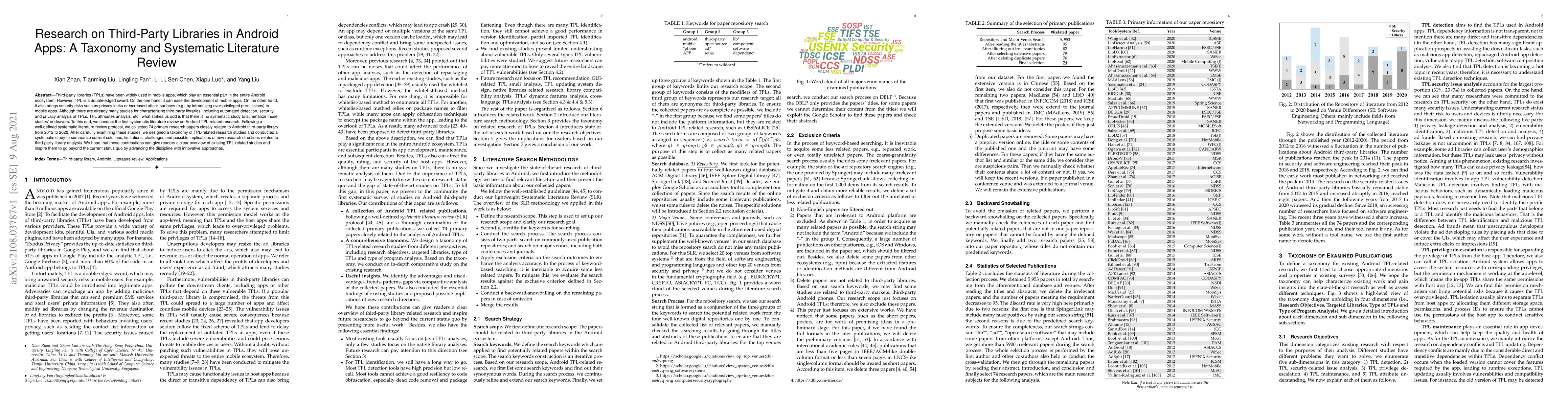 This paper conducts a systematic literature review on Android third-party libraries, summarizing 74 studies from 2012 to 2020 to analyze their attributes, challenges, and security risks. It proposes a taxonomy to categorize the research and highlights current limitations and future research directions.