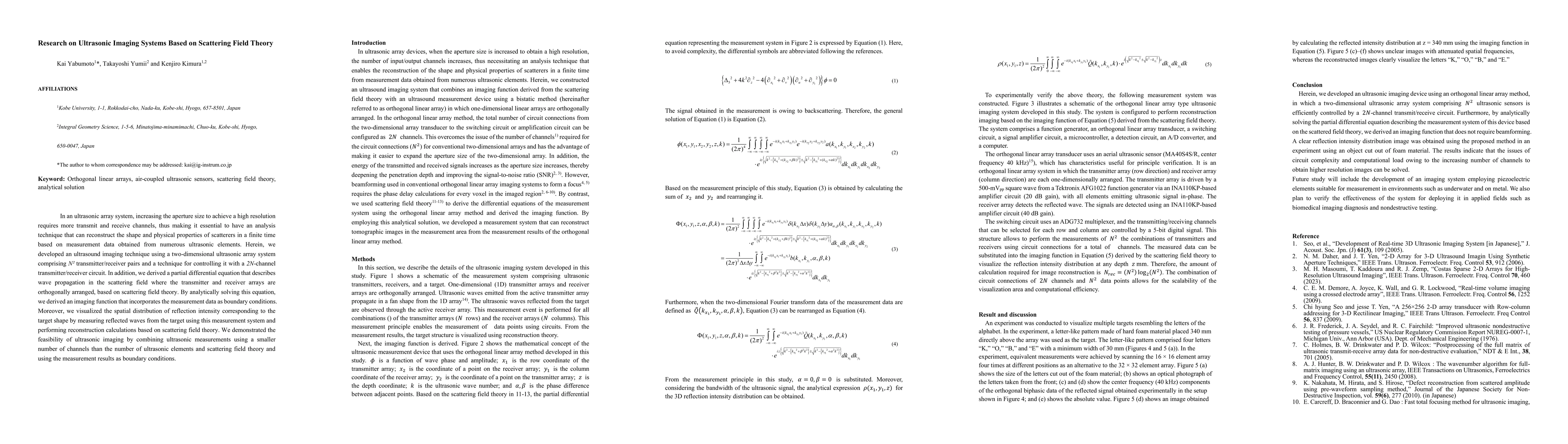 The research presents an ultrasonic imaging technique using a 2D array system with N^2 transmitter/receiver pairs and a 2N-channel circuit. By applying scattering field theory, they derived an imaging function from a partial differential equation describing wave propagation, enabling target shape visualization with fewer channels than elements.