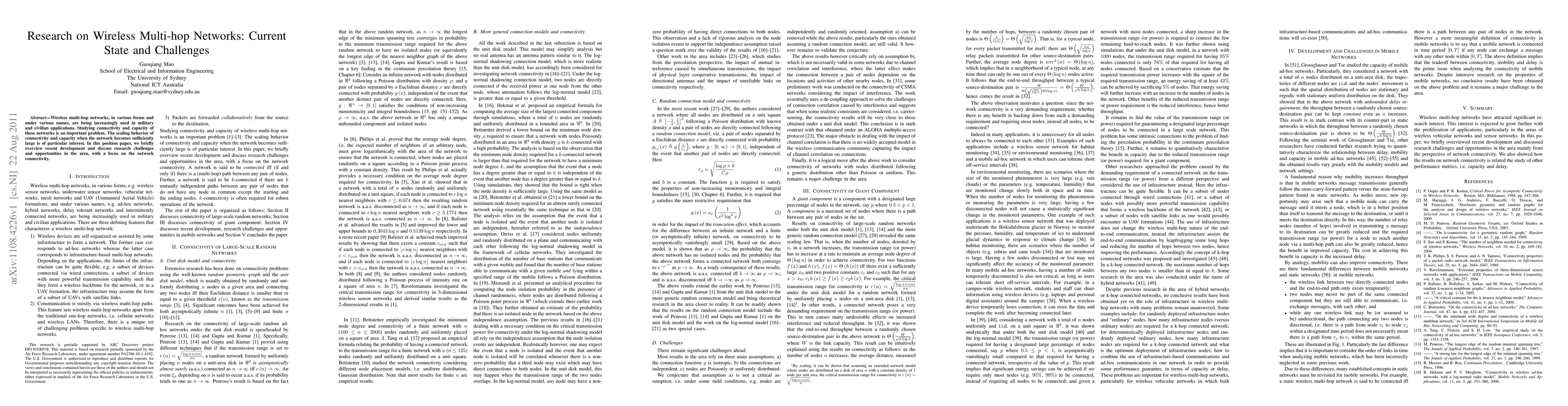 Wireless multi-hop networks, in various forms and under various names, are being increasingly used in military and civilian applications. Studying connectivity and capacity of these networks is an important problem. The scaling behavior of connectivity and capacity when the network becomes sufficiently large is of particular interest. In this position paper, we briefly overview recent development and discuss research challenges and opportunities in the area, with a focus on the network connectivity.