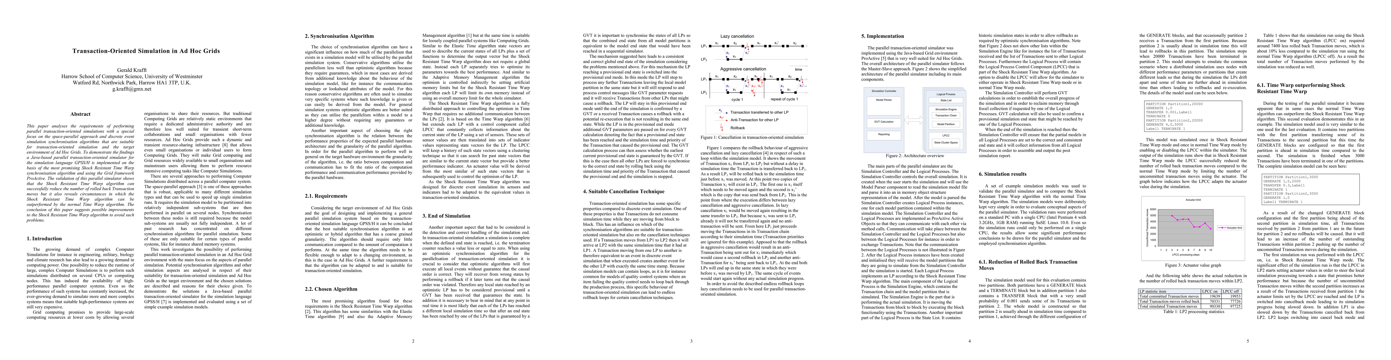 This paper analyses the requirements of performing parallel transaction-oriented simulations with a special focus on the space-parallel approach and discrete event simulation synchronisation algorithms that are suitable for transaction-oriented simulation and the target environment of Ad Hoc Grids. To demonstrate the findings a Java-based parallel transaction-oriented simulator for the simulation language GPSS/H is implemented on the basis of the most promising Shock Resistant Time Warp synchronisation algorithm and using the Grid framework ProActive. The validation of this parallel simulator shows that the Shock Resistant Time Warp algorithm can successfully reduce the number of rolled back Transaction moves but it also reveals circumstances in which the Shock Resistant Time Warp algorithm can be outperformed by the normal Time Warp algorithm. The conclusion of this paper suggests possible improvements to the Shock Resistant Time Warp algorithm to avoid such problems.