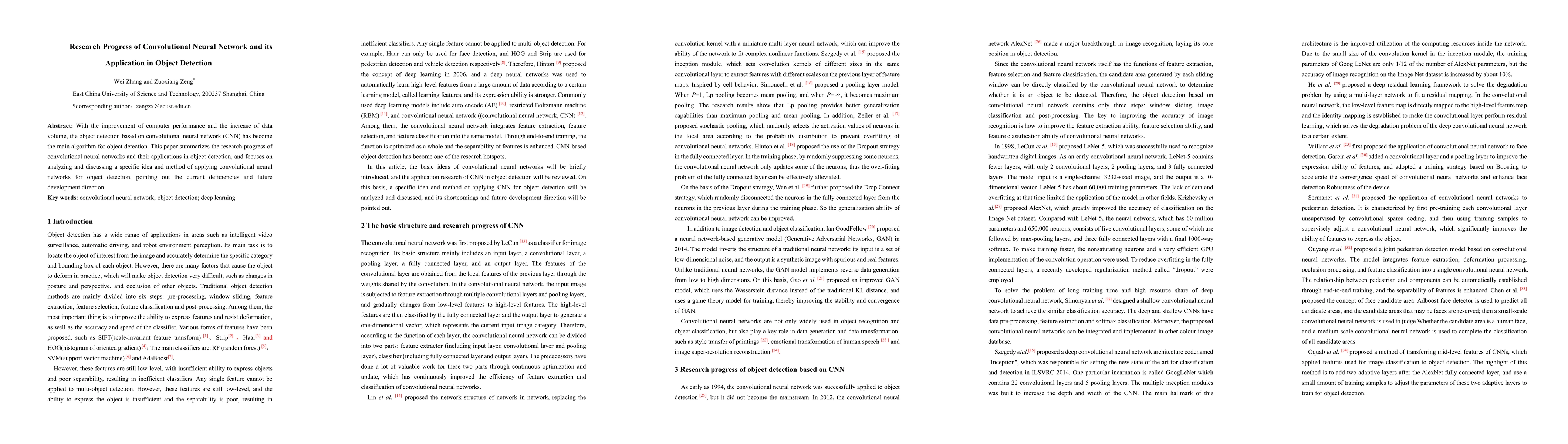 With the improvement of computer performance and the increase of data volume, the object detection based on convolutional neural network (CNN) has become the main algorithm for object detection. This paper summarizes the research progress of convolutional neural networks and their applications in object detection, and focuses on analyzing and discussing a specific idea and method of applying convolutional neural networks for object detection, pointing out the current deficiencies and future development direction.