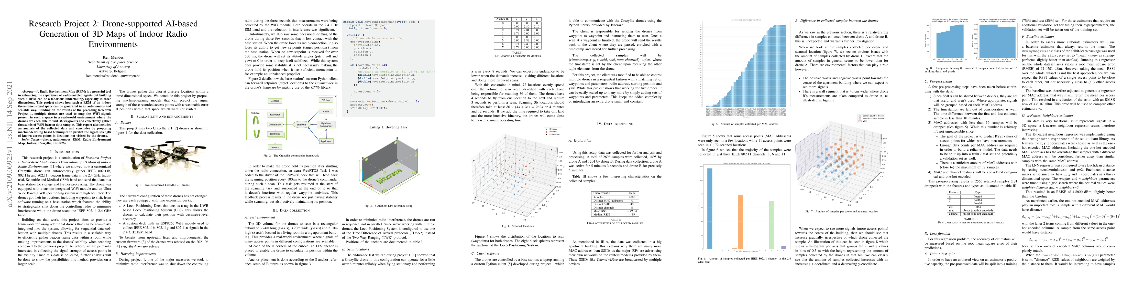 A Radio Environment Map (REM) is a powerful tool in enhancing the experience of radio-enabled agents but building such a REM can be a laborious undertaking, especially in three dimensions. This project shows how such a REM of an indoor three-dimensional space can be generated in an autonomous and scalable way. Building on the results of the preceding Research Project 1, multiple drones are used to map the WiFi signals present in such a space in a real-world environment where the drones are each able to visit 36 waypoints and collectively gather thousands of WiFi beacon data samples. This report also includes an analysis of the collected data and concludes by proposing machine-learning based techniques to predict the signal strength of known access points in locations not visited by the drones.