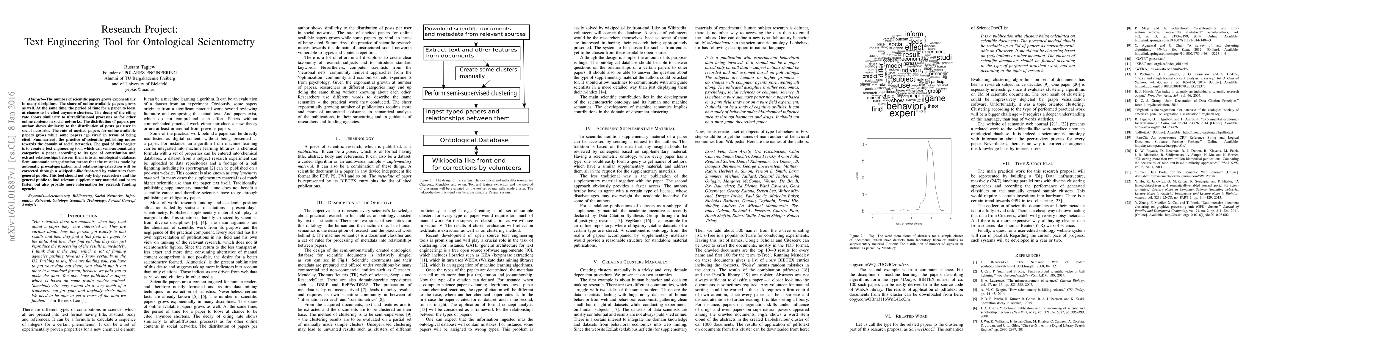 The number of scientific papers grows exponentially in many disciplines. The share of online available papers grows as well. At the same time, the period of time for a paper to loose at chance to be cited anymore shortens. The decay of the citing rate shows similarity to ultradiffusional processes as for other online contents in social networks. The distribution of papers per author shows similarity to the distribution of posts per user in social networks. The rate of uncited papers for online available papers grows while some papers 'go viral' in terms of being cited. Summarized, the practice of scientific publishing moves towards the domain of social networks. The goal of this project is to create a text engineering tool, which can semi-automatically categorize a paper according to its type of contribution and extract relationships between them into an ontological database. Semi-automatic categorization means that the mistakes made by automatic pre-categorization and relationship-extraction will be corrected through a wikipedia-like front-end by volunteers from general public. This tool should not only help researchers and the general public to find relevant supplementary material and peers faster, but also provide more information for research funding agencies.