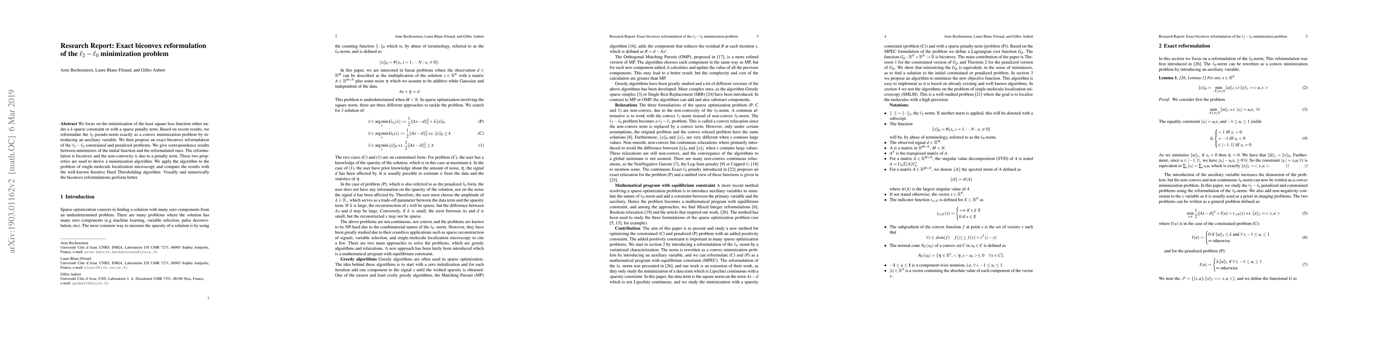 This paper reformulates the $\ell_2-\ell_0$ minimization problem as an exact biconvex problem using an auxiliary variable, providing a new minimization algorithm that outperforms the Iterative Hard Thresholding algorithm in single-molecule localization microscopy. The reformulation maintains correspondence between the original and reformulated problem minimizers.