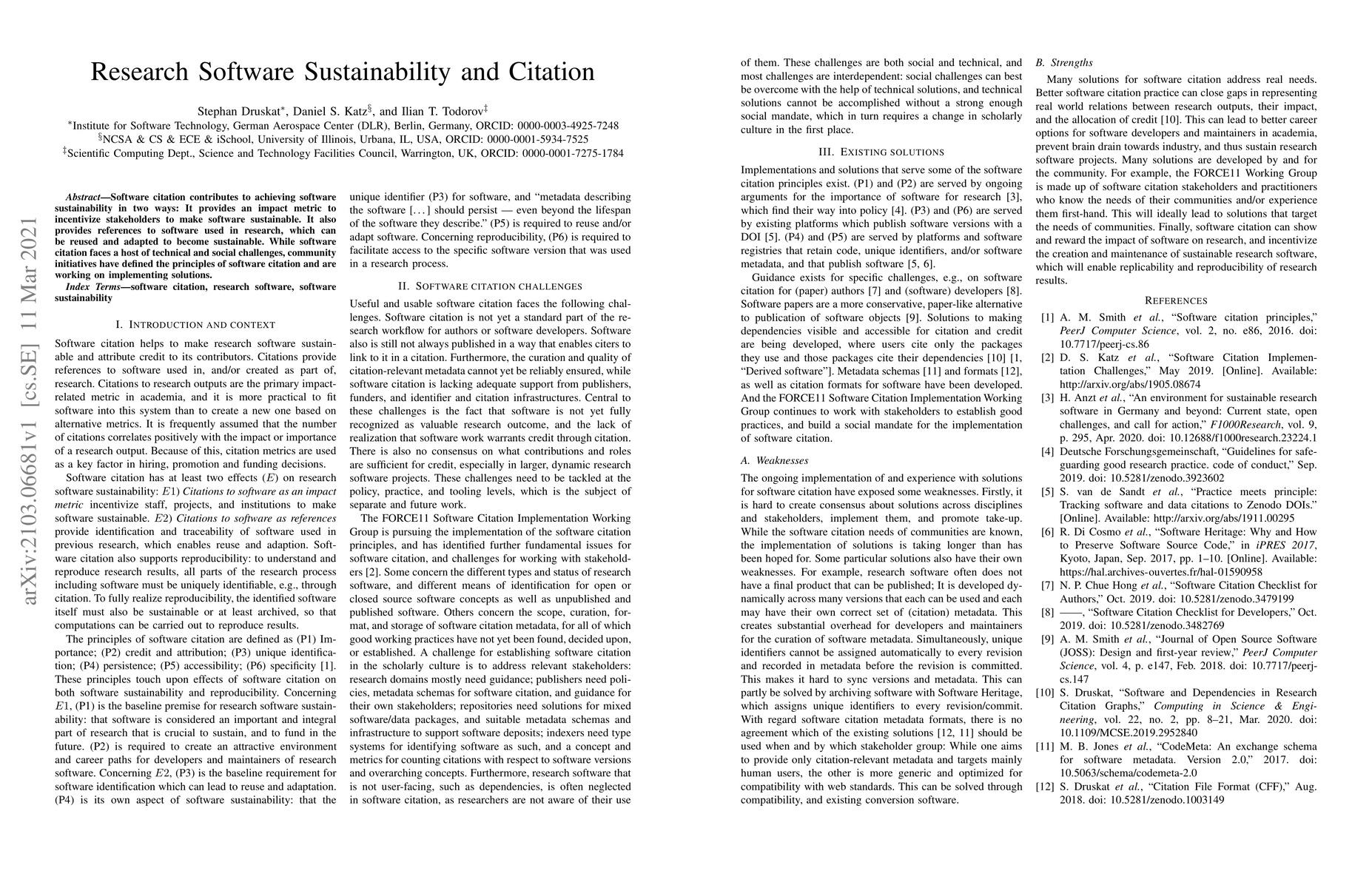 Software citation helps achieve software sustainability by providing impact metrics and reusable references, despite technical and social challenges. Community initiatives define principles and solutions for implementing software citation practices.