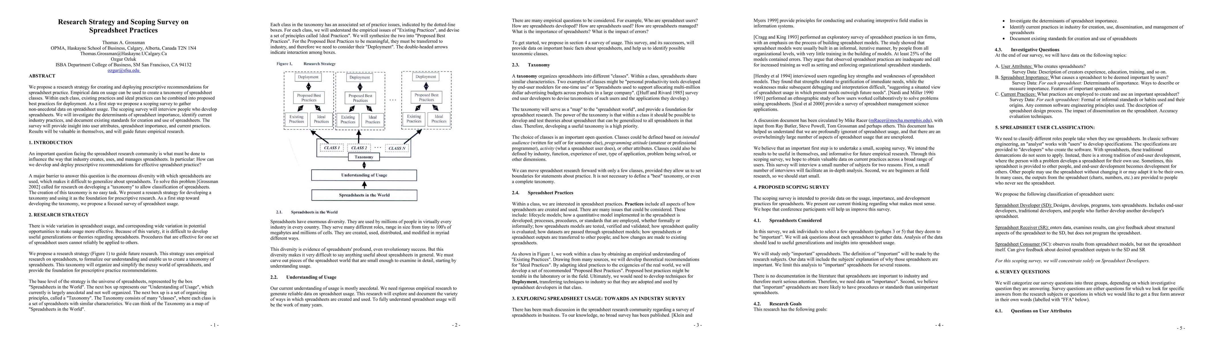 We propose a research strategy for creating and deploying prescriptive recommendations for spreadsheet practice. Empirical data on usage can be used to create a taxonomy of spreadsheet classes. Within each class, existing practices and ideal practices can he combined into proposed best practices for deployment. As a first step we propose a scoping survey to gather non-anecdotal data on spreadsheet usage. The scoping survey will interview people who develop spreadsheets. We will investigate the determinants of spreadsheet importance, identify current industry practices, and document existing standards for creation and use of spreadsheets. The survey will provide insight into user attributes, spreadsheet importance, and current practices. Results will be valuable in themselves, and will guide future empirical research.