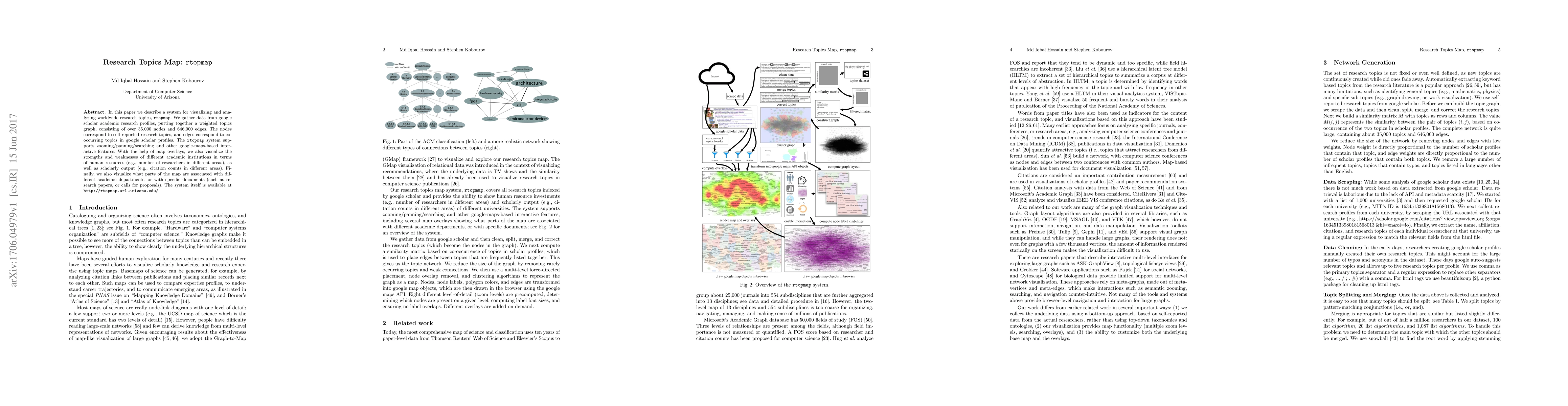 In this paper we describe a system for visualizing and analyzing worldwide research topics, {\tt rtopmap}. We gather data from google scholar academic research profiles, putting together a weighted topics graph, consisting of over 35,000 nodes and 646,000 edges. The nodes correspond to self-reported research topics, and edges correspond to co-occurring topics in google scholar profiles. The {\tt rtopmap} system supports zooming/panning/searching and other google-maps-based interactive features. With the help of map overlays, we also visualize the strengths and weaknesses of different academic institutions in terms of human resources (e.g., number of researchers in different areas), as well as scholarly output (e.g., citation counts in different areas). Finally, we also visualize what parts of the map are associated with different academic departments, or with specific documents (such as research papers, or calls for proposals). The system itself is available at \url{http://rtopmap.arl.arizona.edu/}.