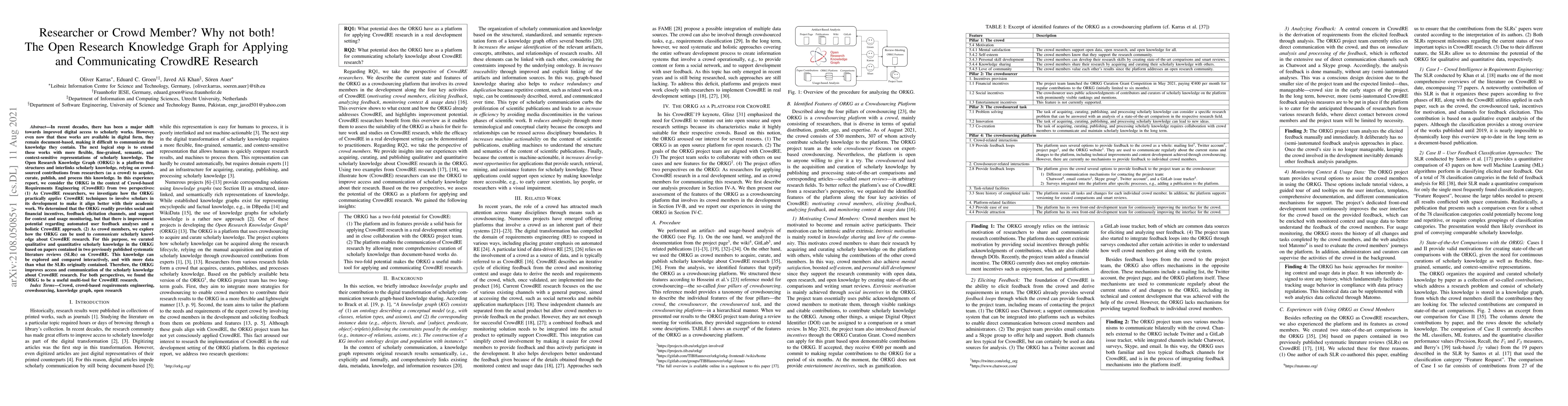 In recent decades, there has been a major shift towards improved digital access to scholarly works. However, even now that these works are available in digital form, they remain document-based, making it difficult to communicate the knowledge they contain. The next logical step is to extend these works with more flexible, fine-grained, semantic, and context-sensitive representations of scholarly knowledge. The Open Research Knowledge Graph (ORKG) is a platform that structures and interlinks scholarly knowledge, relying on crowdsourced contributions from researchers (as a crowd) to acquire, curate, publish, and process this knowledge. In this experience report, we consider the ORKG in the context of Crowd-based Requirements Engineering (CrowdRE) from two perspectives: (1) As CrowdRE researchers, we investigate how the ORKG practically applies CrowdRE techniques to involve scholars in its development to make it align better with their academic work. We determined that the ORKG readily provides social and financial incentives, feedback elicitation channels, and support for context and usage monitoring, but that there is improvement potential regarding automated user feedback analyses and a holistic CrowdRE approach. (2) As crowd members, we explore how the ORKG can be used to communicate scholarly knowledge about CrowdRE research. For this purpose, we curated qualitative and quantitative scholarly knowledge in the ORKG based on papers contained in two previously published systematic literature reviews (SLRs) on CrowdRE. This knowledge can be explored and compared interactively, and with more data than what the SLRs originally contained. Therefore, the ORKG improves access and communication of the scholarly knowledge about CrowdRE research. For both perspectives, we found the ORKG to be a useful multi-tool for CrowdRE research.