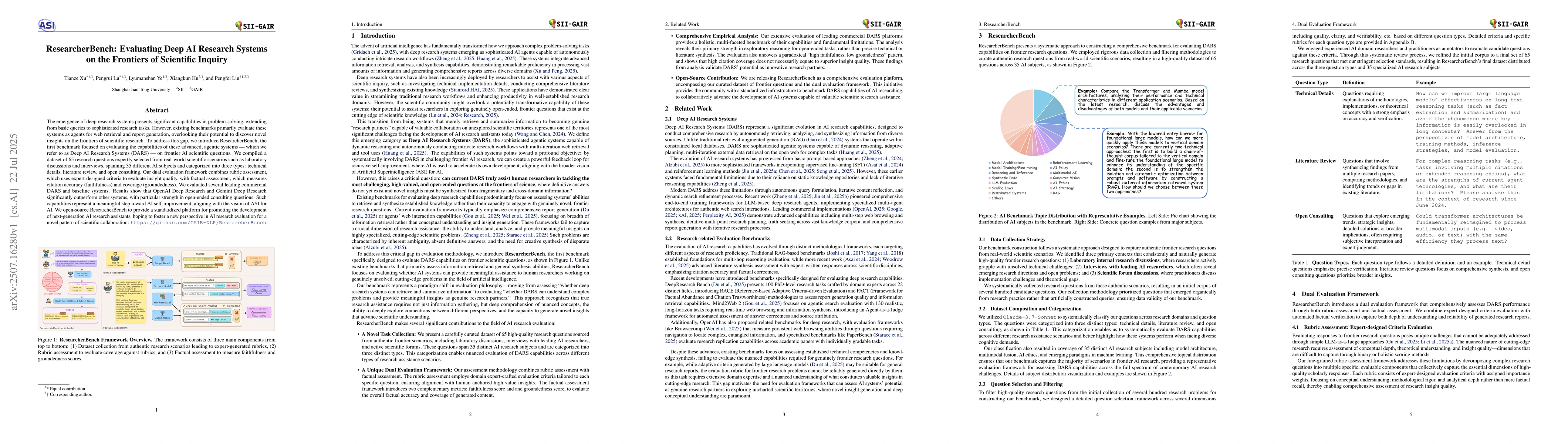 The emergence of deep research systems presents significant capabilities in problem-solving, extending from basic queries to sophisticated research tasks. However, existing benchmarks primarily evaluate these systems as agents for web retrieval and report generation, overlooking their potential to discover novel insights on the frontiers of scientific research. To address this gap, we introduce ResearcherBench, the first benchmark focused on evaluating the capabilities of these advanced, agentic systems - which we refer to as Deep AI Research Systems (DARS) - on frontier AI scientific questions. We compiled a dataset of 65 research questions expertly selected from real-world scientific scenarios such as laboratory discussions and interviews, spanning 35 different AI subjects and categorized into three types: technical details, literature review, and open consulting. Our dual evaluation framework combines rubric assessment, which uses expert-designed criteria to evaluate insight quality, with factual assessment, which measures citation accuracy (faithfulness) and coverage (groundedness). We evaluated several leading commercial DARS and baseline systems. Results show that OpenAI Deep Research and Gemini Deep Research significantly outperform other systems, with particular strength in open-ended consulting questions. Such capabilities represent a meaningful step toward AI self-improvement, aligning with the vision of ASI for AI. We open-source ResearcherBench to provide a standardized platform for promoting the development of next-generation AI research assistants, hoping to foster a new perspective in AI research evaluation for a novel pattern of scientific collaboration: https://github.com/GAIR-NLP/ResearcherBench.