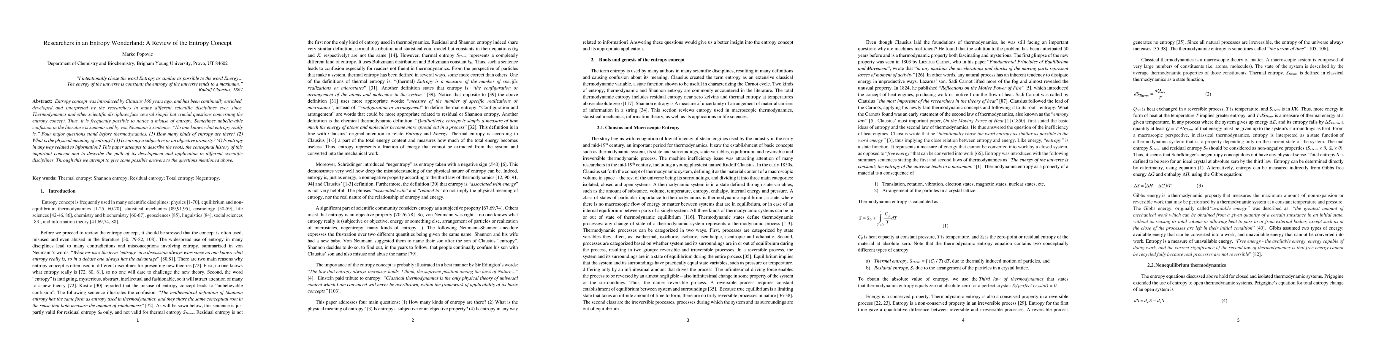 Entropy concept was introduced by Clausius 160 years ago, and has been continually enriched, developed and interpreted by the researchers in many different scientific disciplines ever since. Thermodynamics and other scientific disciplines face several simple but crucial questions concerning the entropy concept. Thus, it is frequently possible to notice a misuse of entropy. Sometimes unbelievable confusion in the literature is summarized by von Neumann's sentence: "No one knows what entropy really is." Four major questions stand before thermodynamics. (1) How many kinds of entropy are there? (2) What is the physical meaning of entropy? (3) Is entropy a subjective or an objective property? (4) Is entropy in any way related to information? This paper attempts to describe the roots, the conceptual history of this important concept and to describe the path of its development and application in different scientific disciplines. Through this we attempt to give some possible answers to the questions mentioned above.