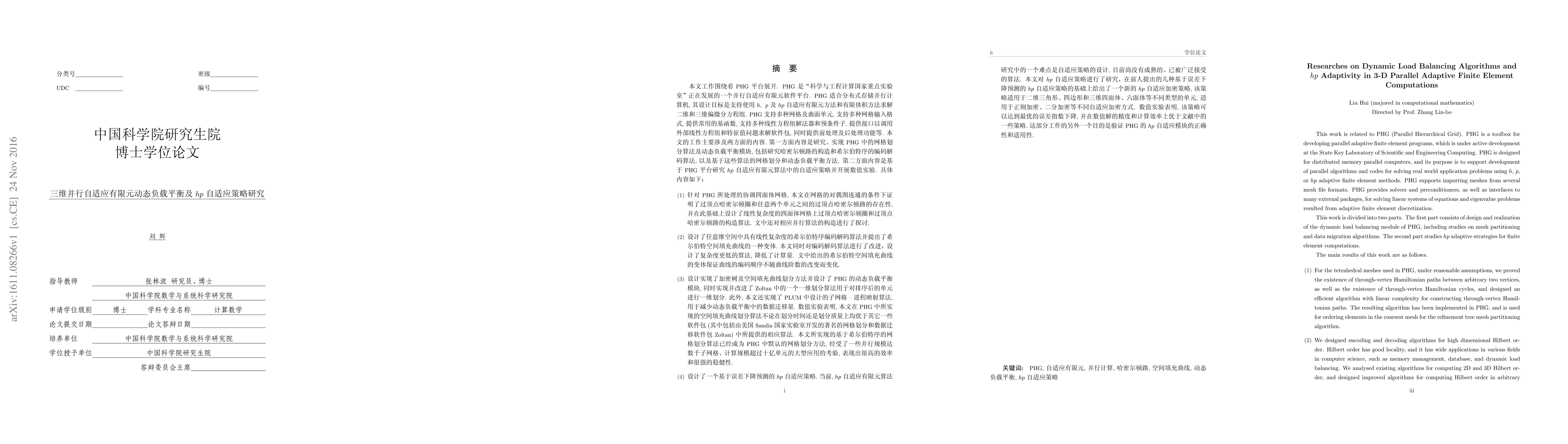 This work is related to PHG (Parallel Hierarchical Grid). PHG is a toolbox for developing parallel adaptive finite element programs, which is under active development at the State Key Laboratory of Scientific and Engineering Computing. The main results of this work are as follows. 1) For the tetrahedral meshes used in PHG, under reasonable assumptions, we proved the existence of through-vertex Hamiltonian paths between arbitrary two vertices, as well as the existence of through-vertex Hamiltonian cycles, and designed an efficient algorithm with linear complexity for constructing through-vertex Hamiltonian paths. The resulting algorithm has been implemented in PHG, and is used for ordering elements in the coarsest mesh for the refinement tree mesh partitioning algorithm. 2) We designed encoding and decoding algorithms for high dimensional Hilbert order. Hilbert order has good locality, and it has wide applications in various fields in computer science, such as memory management, database, and dynamic load balancing. 3) We implemented refinement tree and space filling curve based mesh partitioning algorithms in PHG, and designed the dynamic load balancing module of PHG. The refinement tree based partitioning algorithm was originally proposed by Mitchell, the one implemented in PHG was improved in several aspects. The space filling curve based mesh partitioning function in PHG can use either Hilbert or Morton space filling curve. 4) We studied existing hp-adaptive strategies in the literature, and proposed a new strategy. Numerical experiments show that our new strategy achieves exponential convergence, and is superior, in both precision of the solutions and computation time, to the strategy compared. This part of the work also serves to validate the hp-adaptivity module of PHG.