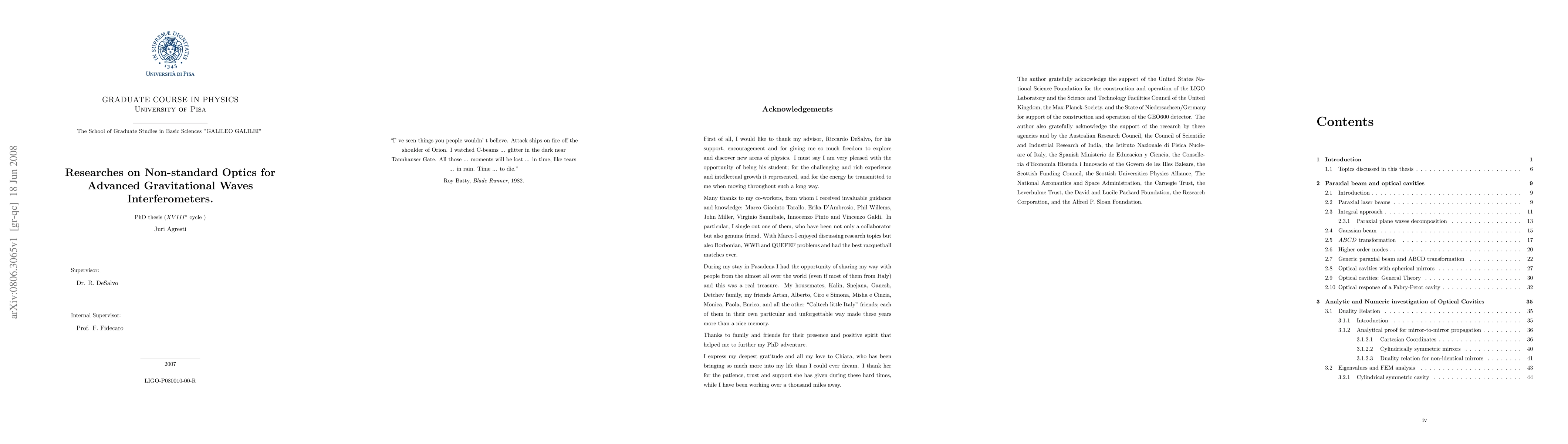 This thesis presents a collection of different researches on non-standard optics in view of enhancing the performances of the Advanced Gravitational waves interferometric detectors, where the thermal noise of the test masses is expected to be a limiting factor for their sensitivity. We provide a quantitative analysis of the impact of non-Gaussian beams on different kinds of thermal noises. We developed the theory of mesa beam, in view of a future implementation in advanced GW interferometers of the mesa beam idea, focusing on the analytical derivation of the quantities (i.e. beam width, divergence, propagation factor), which are chosen as ISO standard reference parameters for the characterization of an optical beam. We also analytically proved a new duality relation between optical cavities with non-spherical mirrors. The interest of the GW community in this new beam technology led us to the construction and testing of a prototype mesa beam Fabry-Perot cavity with Mexican-hat mirror. Part of the work of this thesis was devoted to the development of new simulation programs of optical systems. These programs provided the theoretical expected behaviour of our experiment, in particular cavity modes structure and misalignments sensitivity to be confronted with the experimental results. We also explored another complementary way of reducing the mirror thermal noise, beside the beam shaping, that is the multi-layered coating thickness optimization. We show it to be effective in reducing the coating noise and explore the possible implications for GW interferometers in terms of sensitivity. During this analysis we developed an independent model for the coating effective elastic parameters, which is based on the well understood subject of homogenization theory.