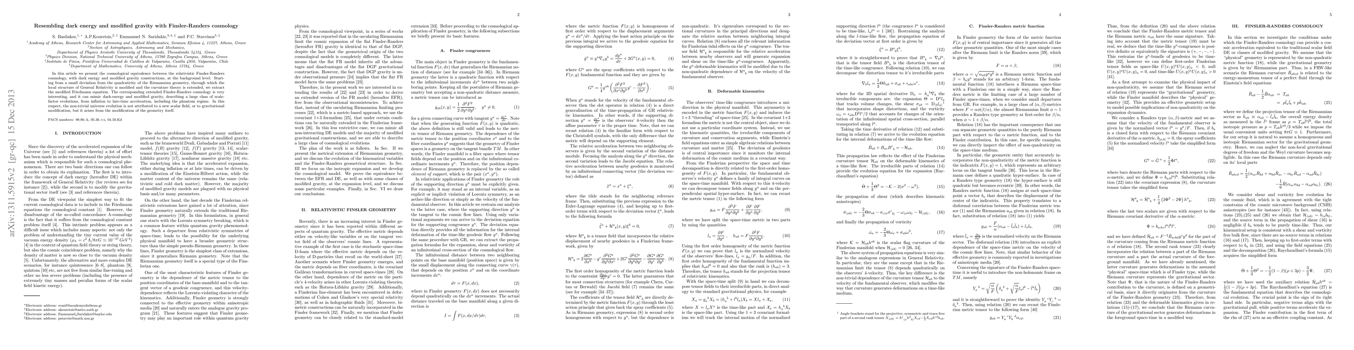 This paper explores the cosmological implications of Finsler-Randers geometry, showing how it can mimic dark energy and modified gravity without invoking new scalar fields or gravitational modifications. The study derives a modified Friedmann equation from a small deviation from Riemannian geometry, describing a wide range of universe evolution scenarios.