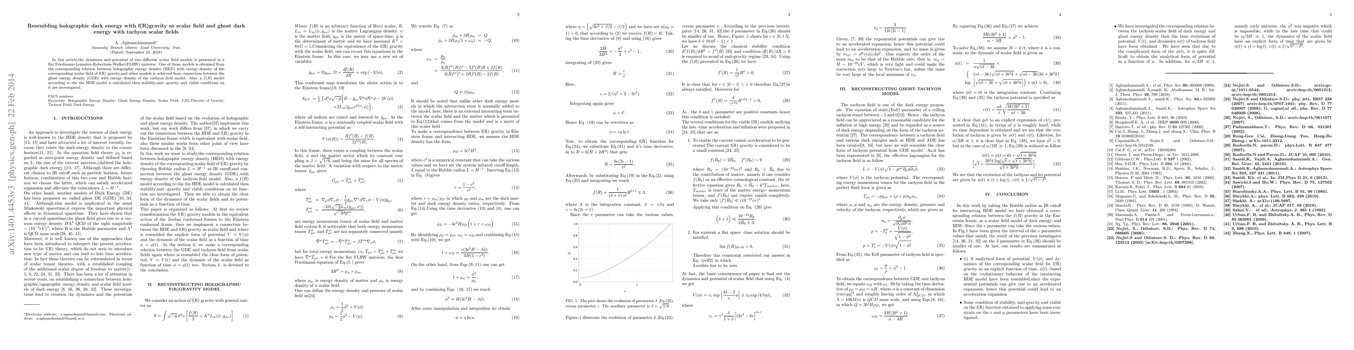 In this article,the dynamics and potential of two different scalar field models is presented in a at Friedmann-Lemaitre-Robertson-Walker(FLRW) universe. One of those models is obtained from the corresponding relation between holographic energy density (HED) with energy density of the corresponding scalar field of f(R) gravity,and other models is achieved from connection between the ghost energy density (GDE) with energy density of the tachyon field model. Also, a f(R) model according to the the HDE model is calculated then stability,anti -gravity and viable conditions on it are investigated.
