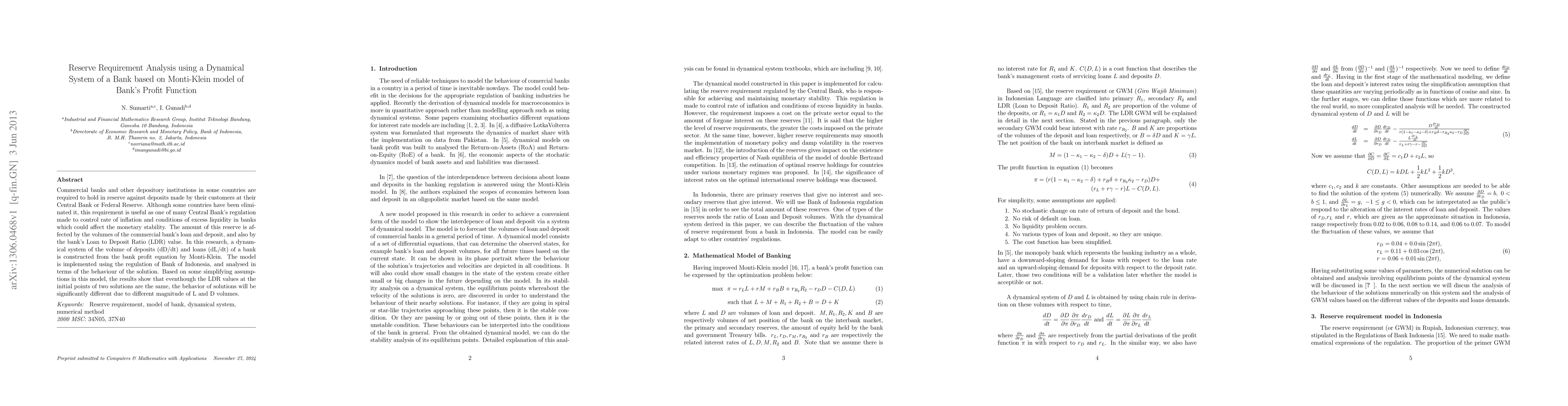 Commercial banks and other depository institutions in some countries are required to hold in reserve against deposits made by their customers at their Central Bank or Federal Reserve. Although some countries have been eliminated it, this requirement is useful as one of many Central Bank's regulation made to control rate of inflation and conditions of excess liquidity in banks which could affect the monetary stability. The amount of this reserve is affected by the volumes of the commercial bank's loan and deposit, and also by the bank's Loan to Deposit Ratio (LDR) value. In this research, a dynamical system of the volume of deposits (dD/dt) and loans (dL/dt) of a bank is constructed from the bank profit equation by Monti-Klein. The model is implemented using the regulation of Bank of Indonesia, and analysed in terms of the behaviour of the solution. Based on some simplifying assumptions in this model, the results show that eventhough the LDR values at the initial points of two solutions are the same, the behavior of solutions will be significantly different due to different magnitude of L and D volumes.